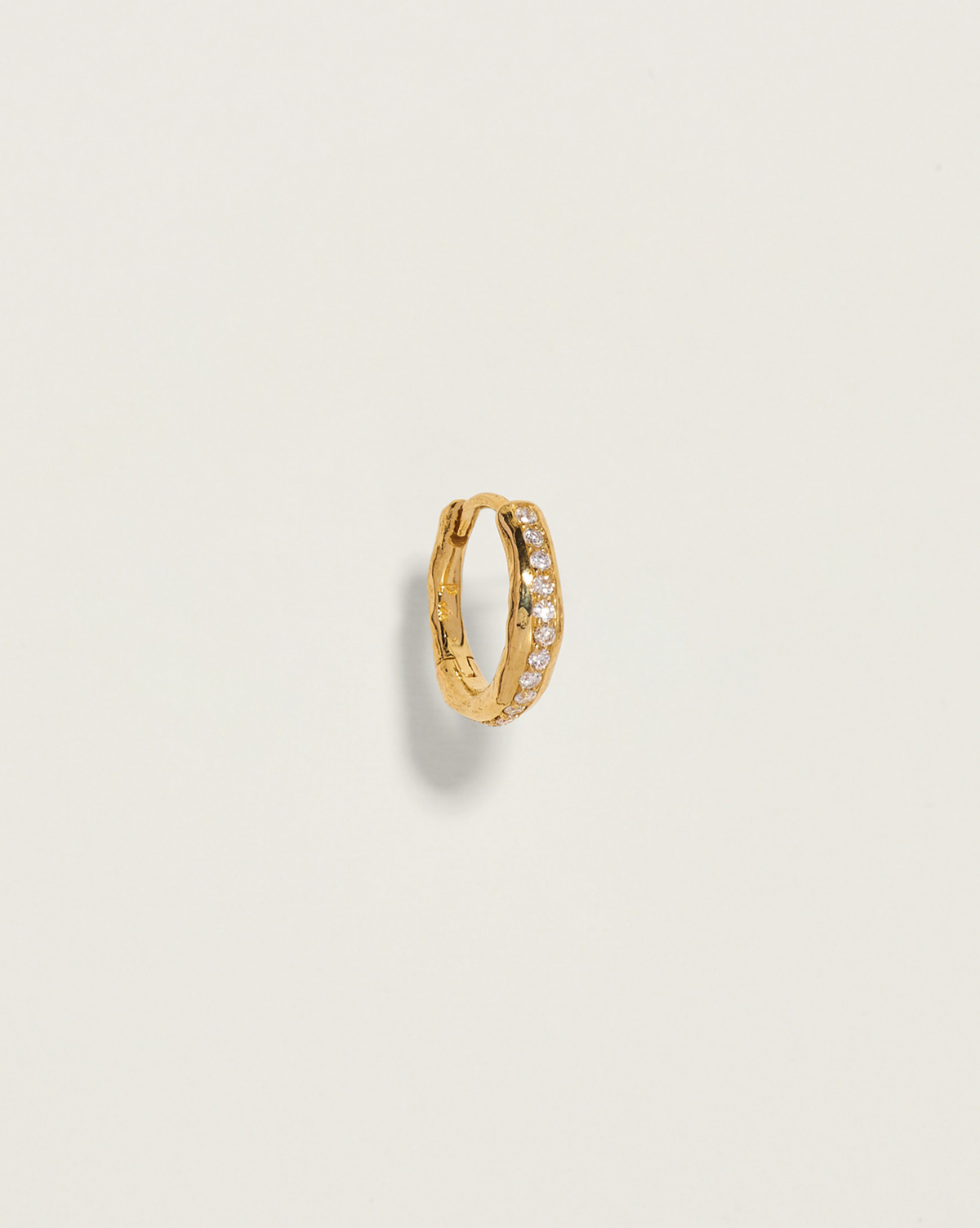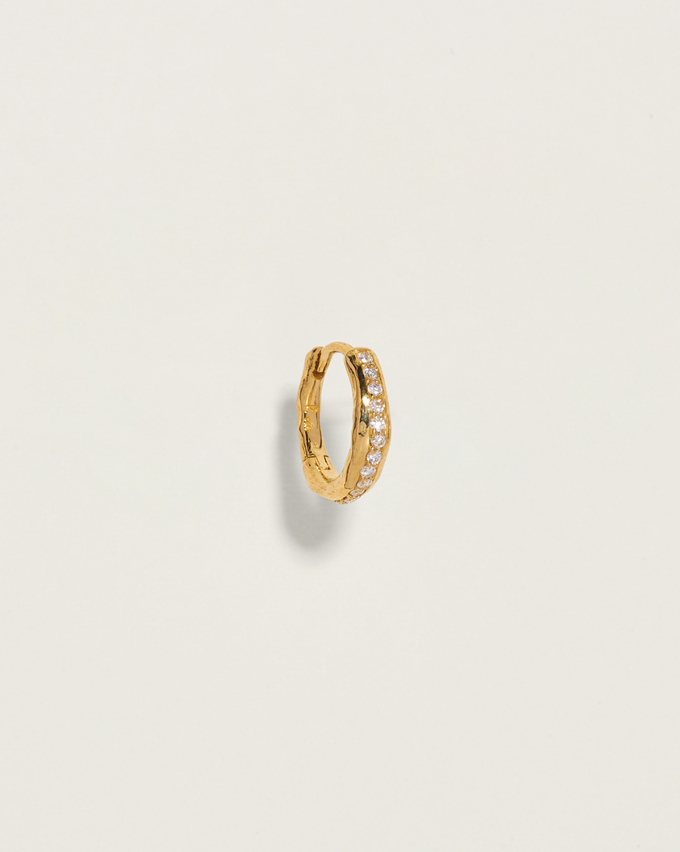 These 10mm Molten Pavé Huggies by Pamela Love feature a dazzling row of pavé-set diamonds, tracing a luminous path along the center of the molten gold hoop. The sculptural fluidity of the gold paired with the brilliance of diamonds creates a refined and modern silhouette. Sold as a single.