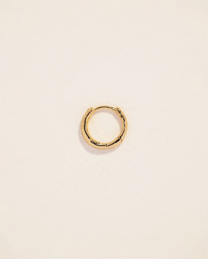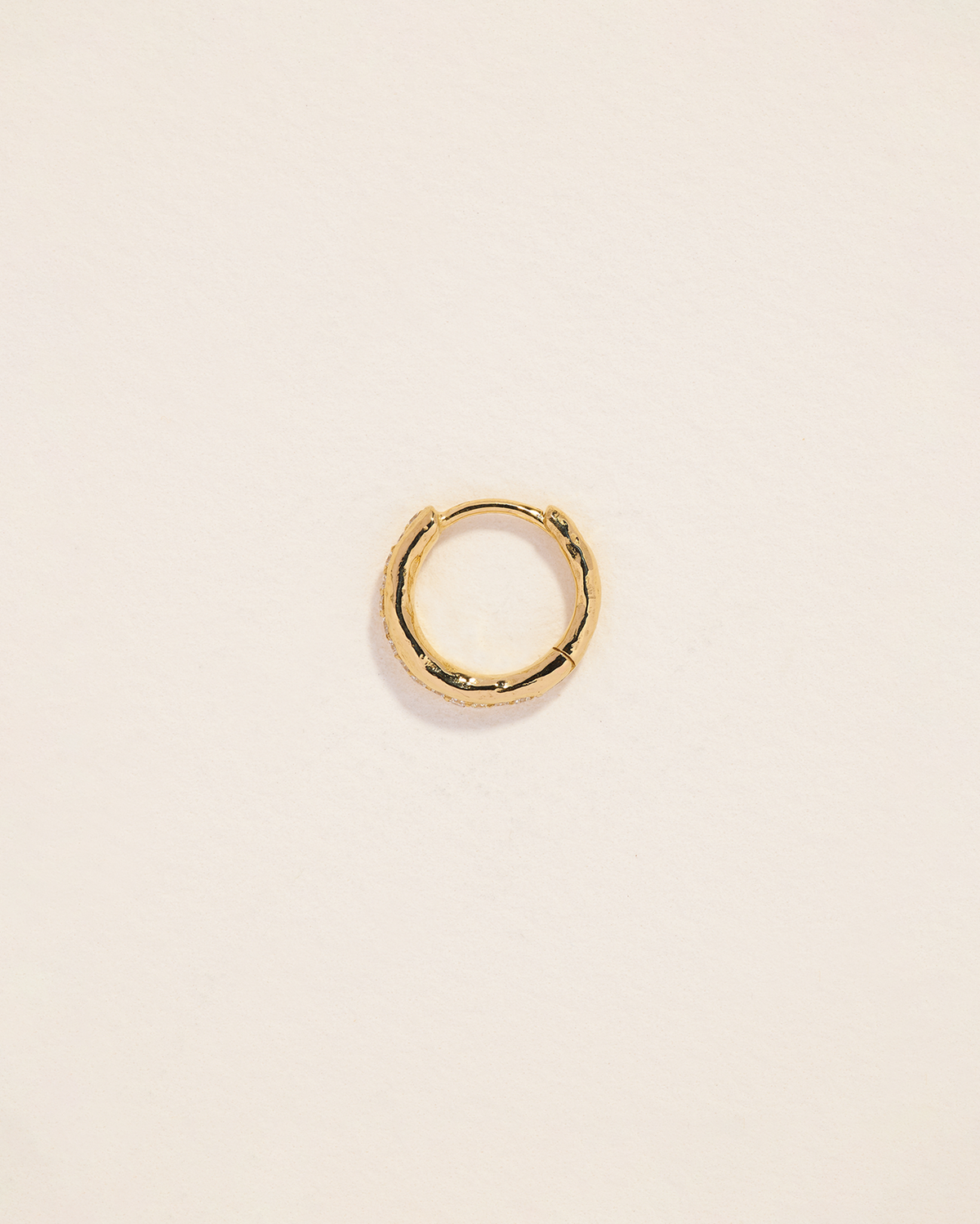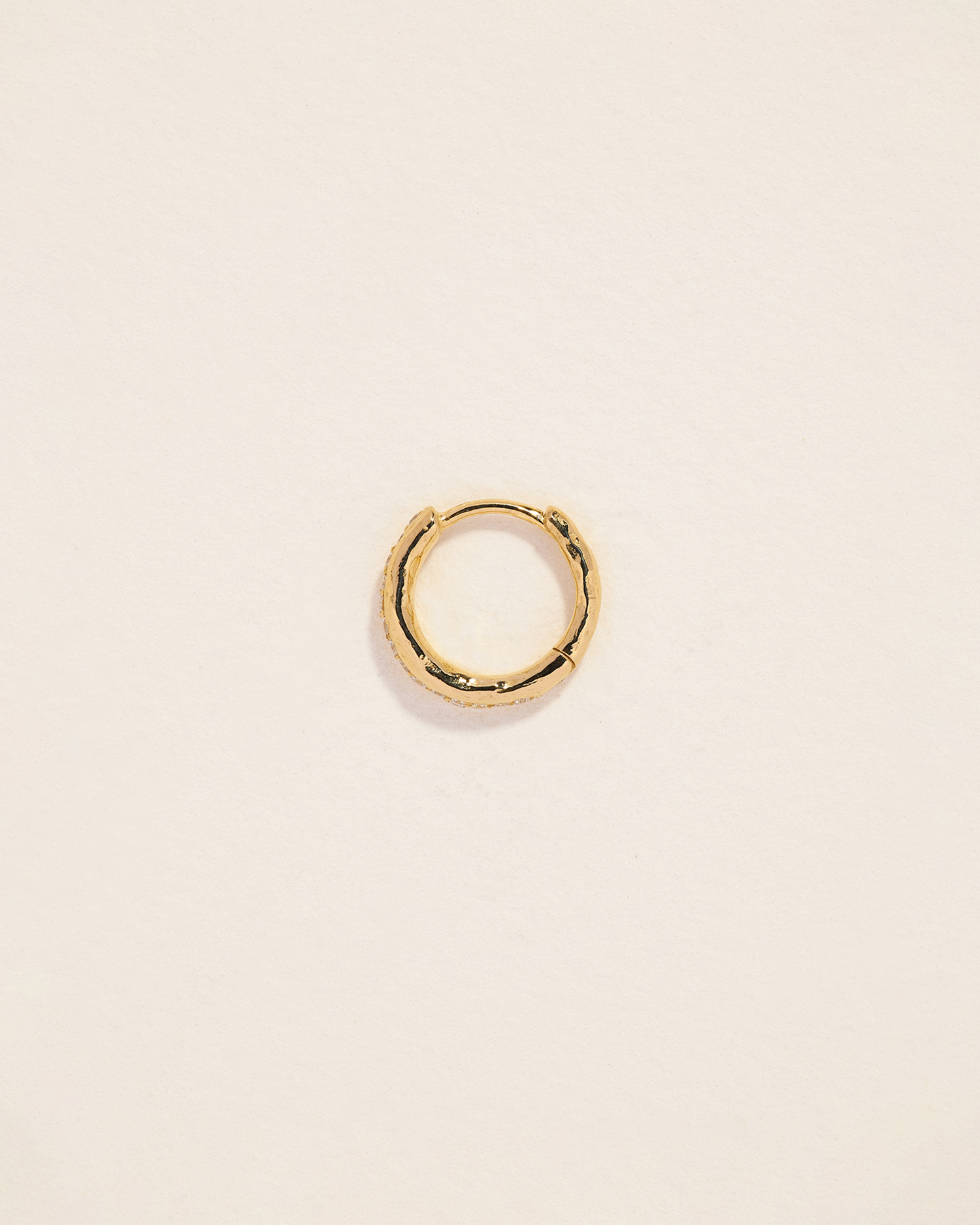Handcrafted in 14k yellow gold with pavé-set diamonds. Huggie measures 10mm in inner diameter, crafted in 19-gauge thickness. Secured with a hinge mechanism and clicker closure.