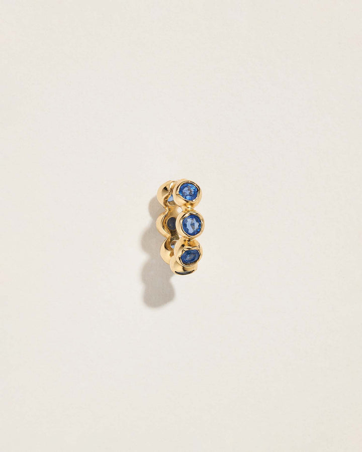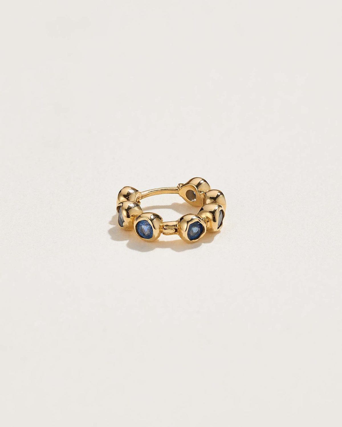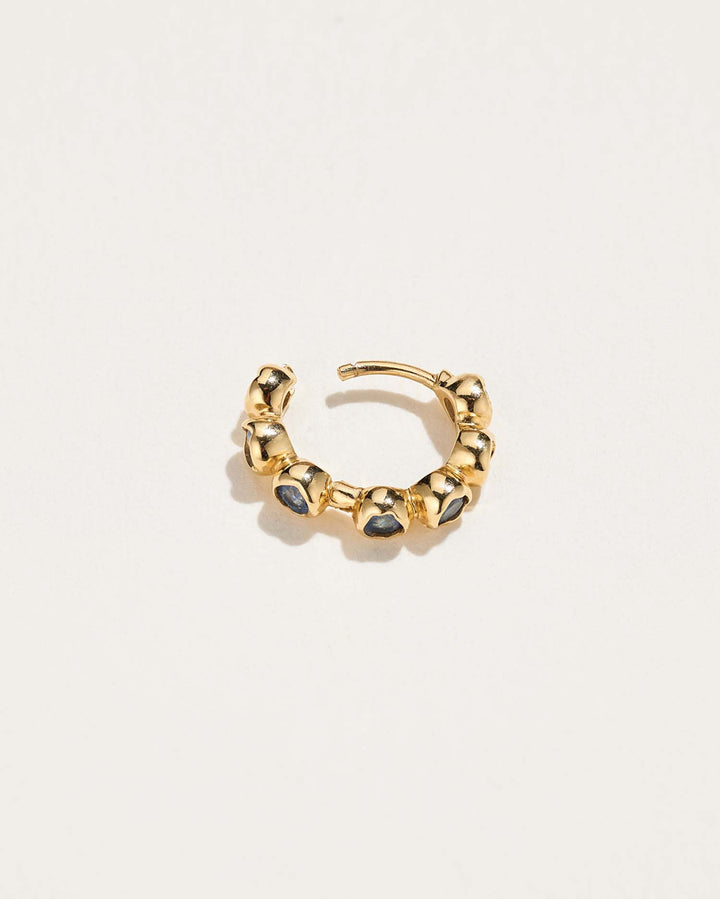 These Molten Stone Huggies by Pamela Love feature a ring of deep blue sapphires, bezel-set in molten gold. The bold yet elegant design enhances the natural radiance of the stones, making them a versatile addition to any curated ear. Perfect for conch, lobe, and helix piercings. Sold as a single.