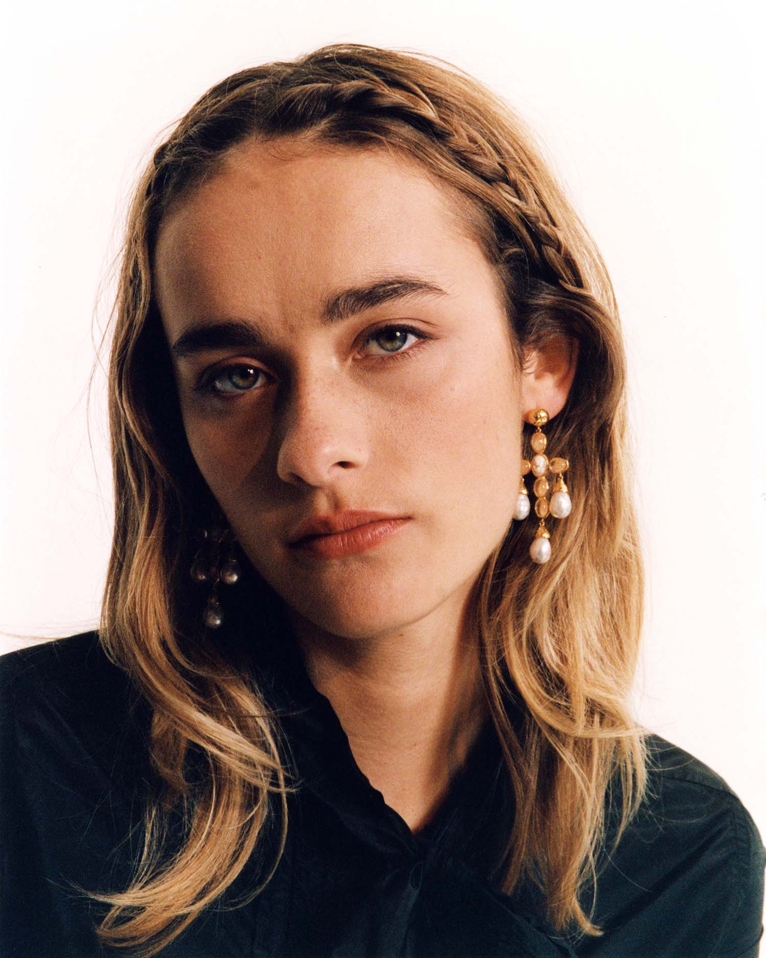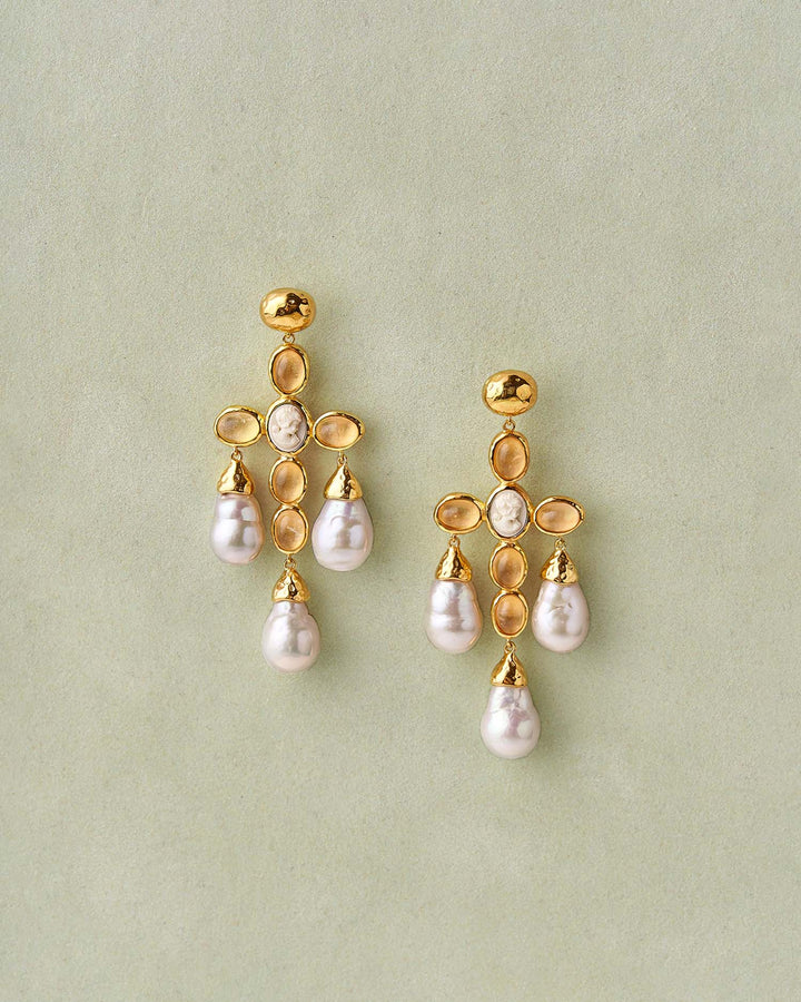These Paola Earrings by Pamela Love exude vintage opulence with their intricate chandelier design, featuring delicate resin cameos, luminous rock crystals, and glowing baroque pearls. A statement of artistry and elegance.