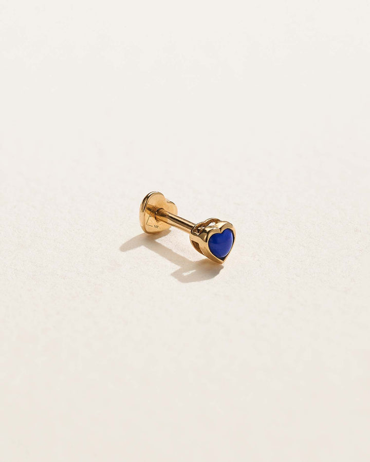 Handcrafted in 14k yellow gold with lapis inlay. Stud measures 4mm with a threaded back post thickness of 16 gauge (1.2mm) and a post length of 6.5mm. Secured with an internally threaded heart back.