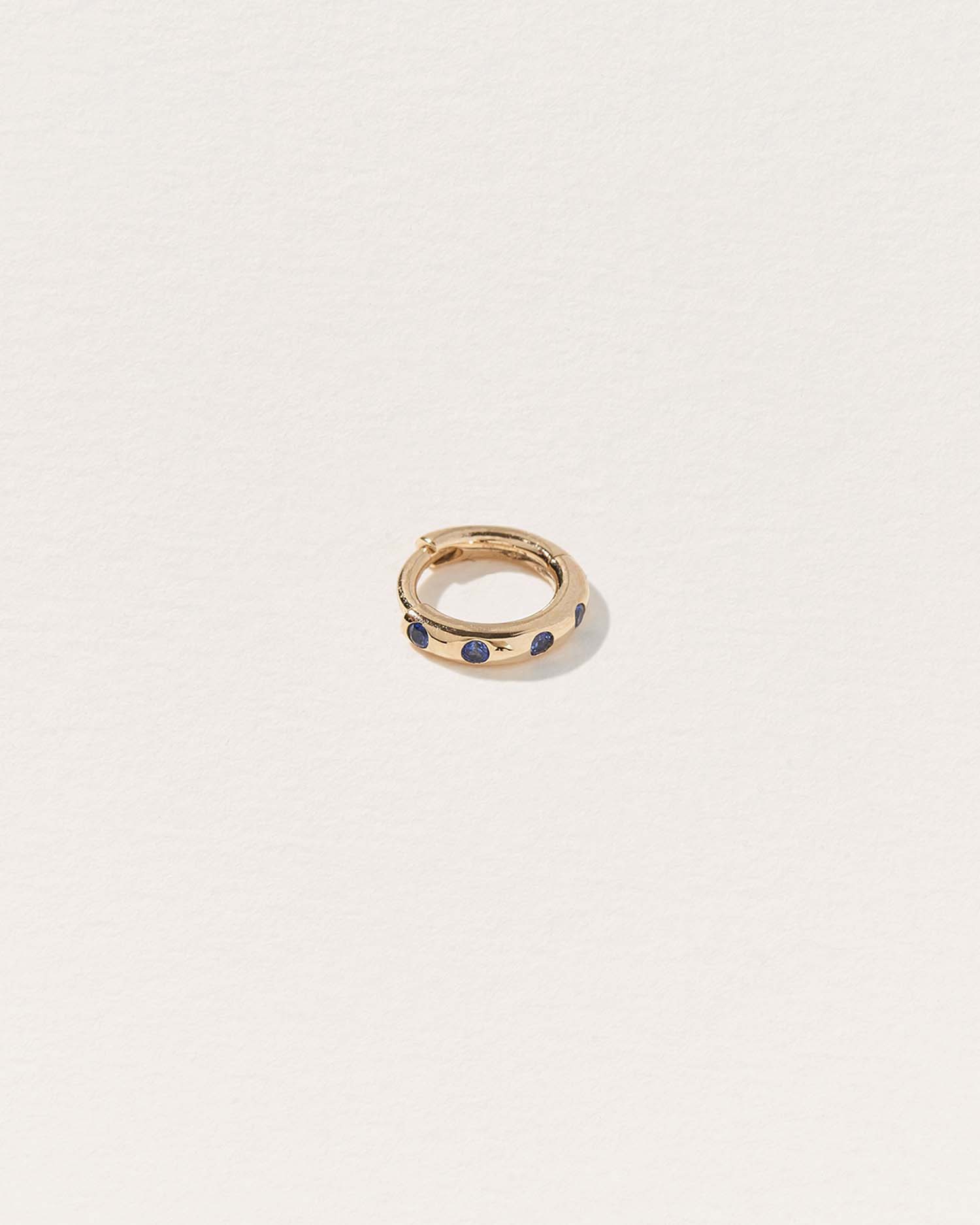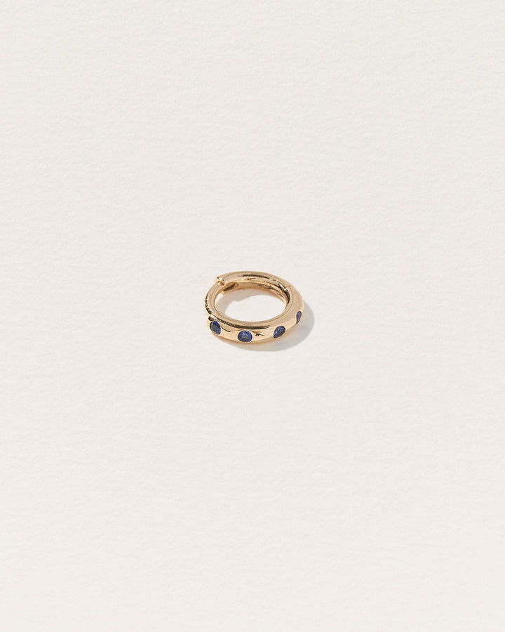 The 6mm Dot Huggie by Pamela Love brings a vibrant, celestial energy to modern piercings. Floating deep blue sapphires are perfectly spaced along the smooth arc of this petite hoop, adding a regal brilliance to the design. Whether worn solo or stacked, the luminous interplay of gold and sapphire creates a timeless, effortlessly cool aesthetic. A versatile piece for the helix, lobe, or tragus. Sold as a single.
