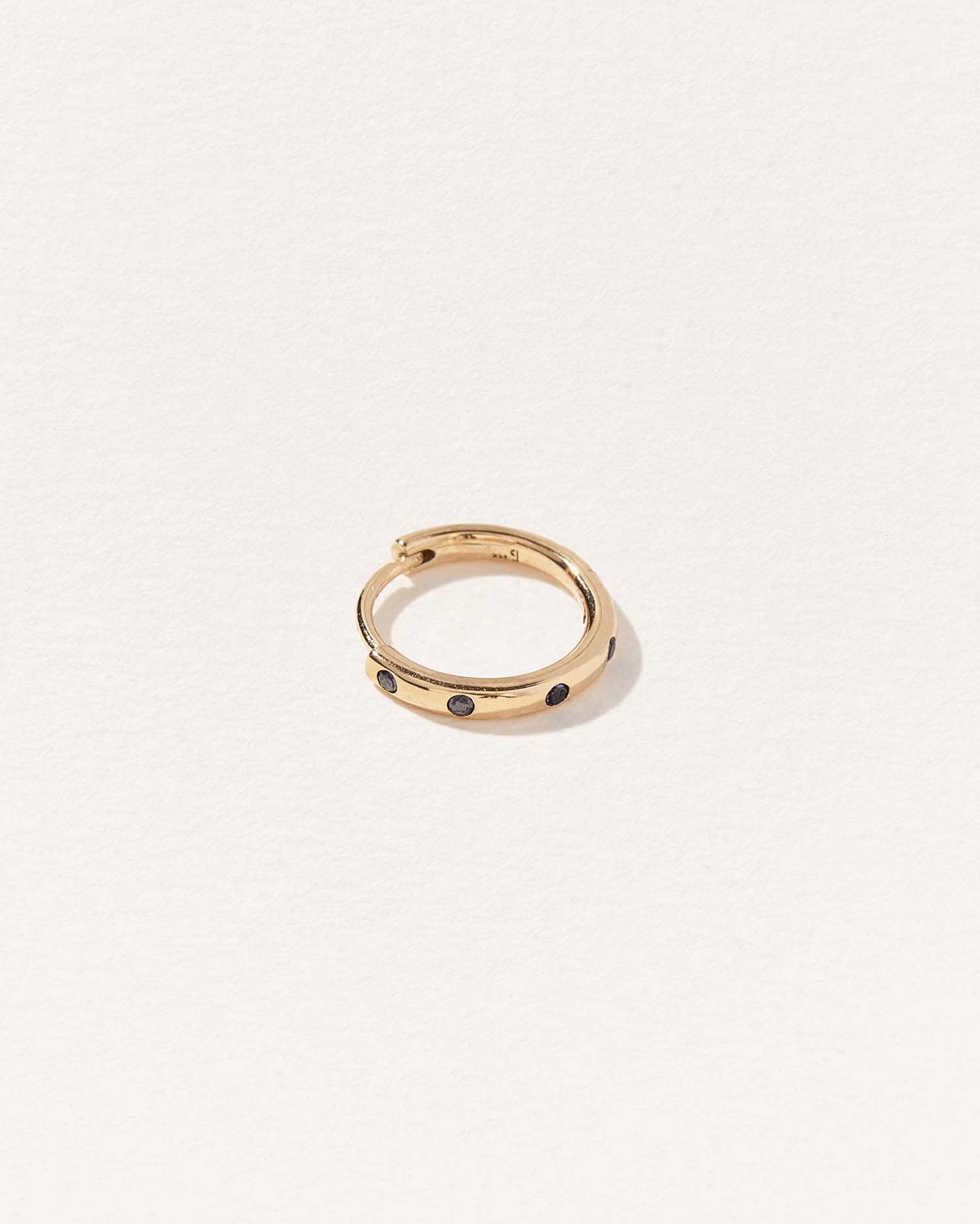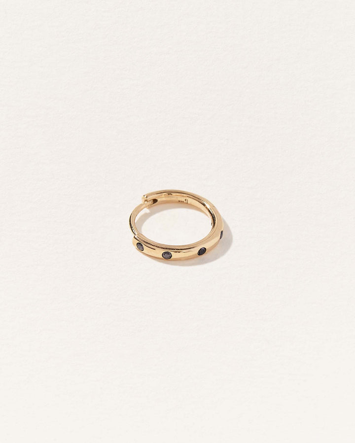 The 10mm Dot Huggie by Pamela Love offers a bold yet refined take on the classic hoop. Floating black diamonds create a striking, graphic effect against the rich 14k gold, giving this larger huggie an edgy sophistication. Designed for effortless stacking or solo wear, this piece is perfect for those who love modern luxury with a subtle statement. Ideal for the helix and lobe. Sold as a single.