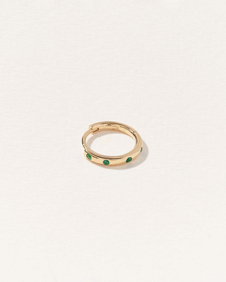 The 10mm Dot Huggie by Pamela Love captures the vivid, natural beauty of emeralds in a sleek yet dynamic design. The lush green stones appear to float weightlessly along the surface of this gold hoop, creating a balance of earthy elegance and contemporary minimalism. A bold choice for the helix and lobe, this piece is ideal for those who appreciate gemstones with depth and meaning. Sold as a single.
