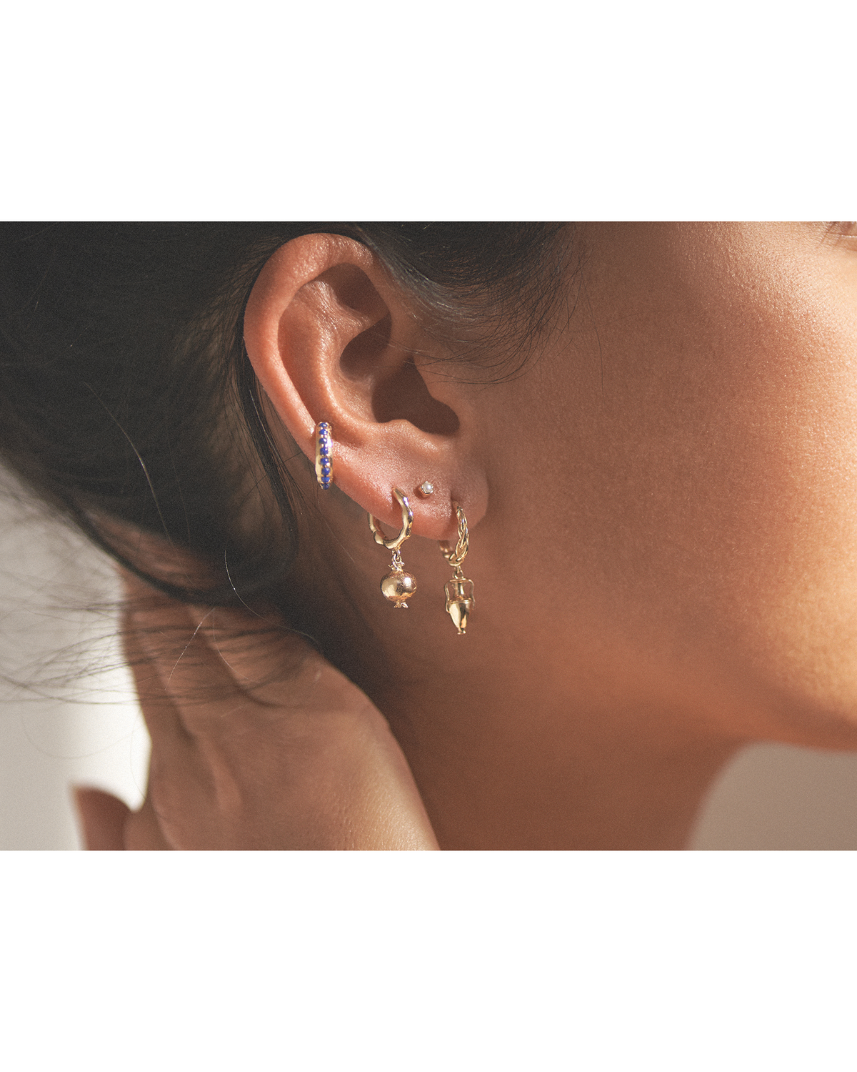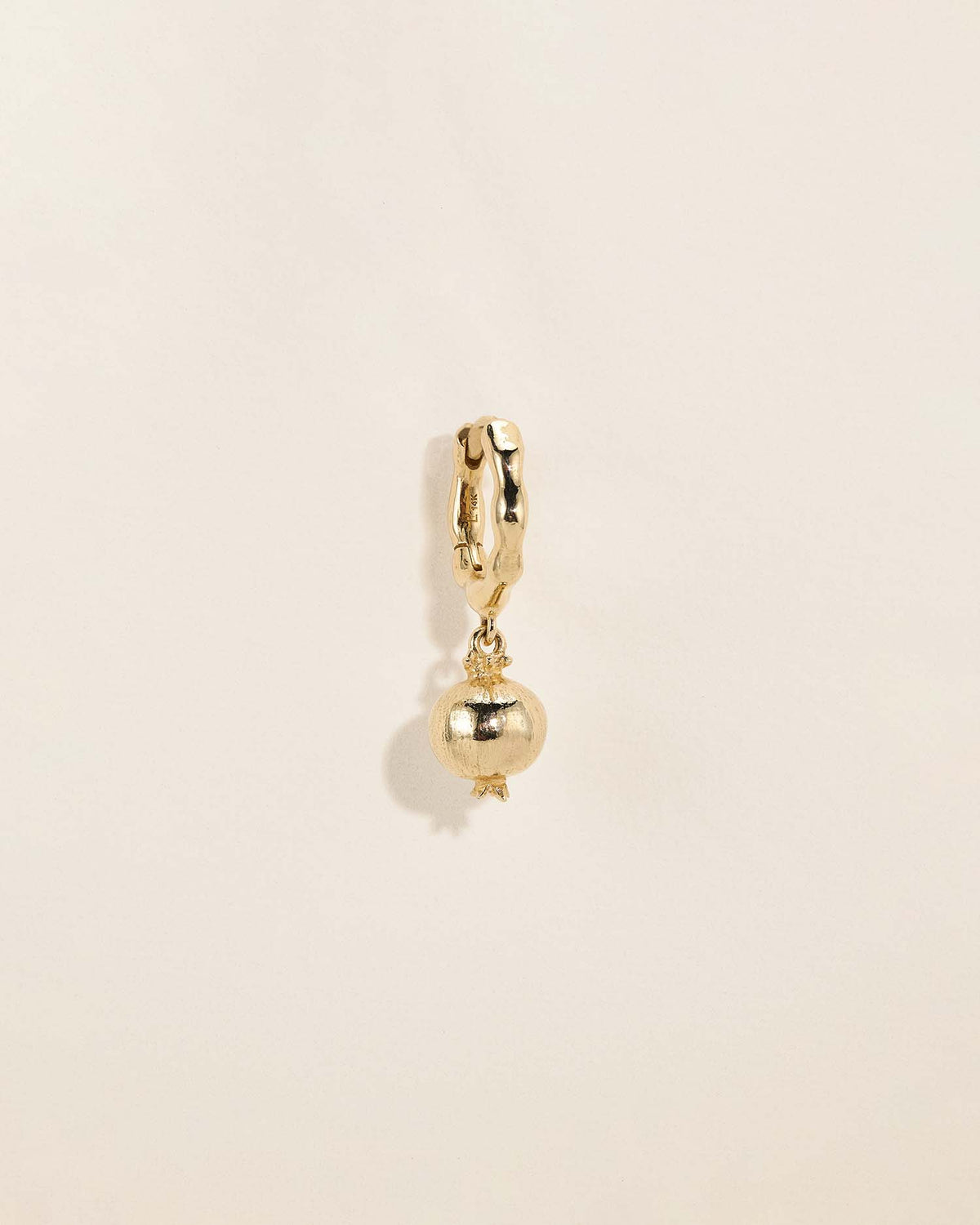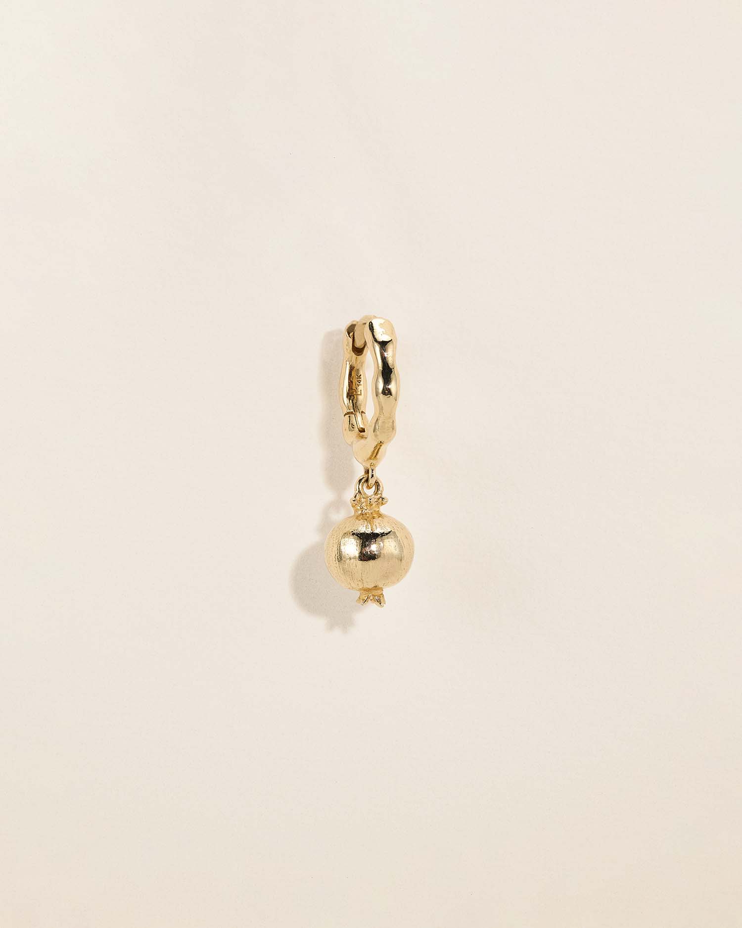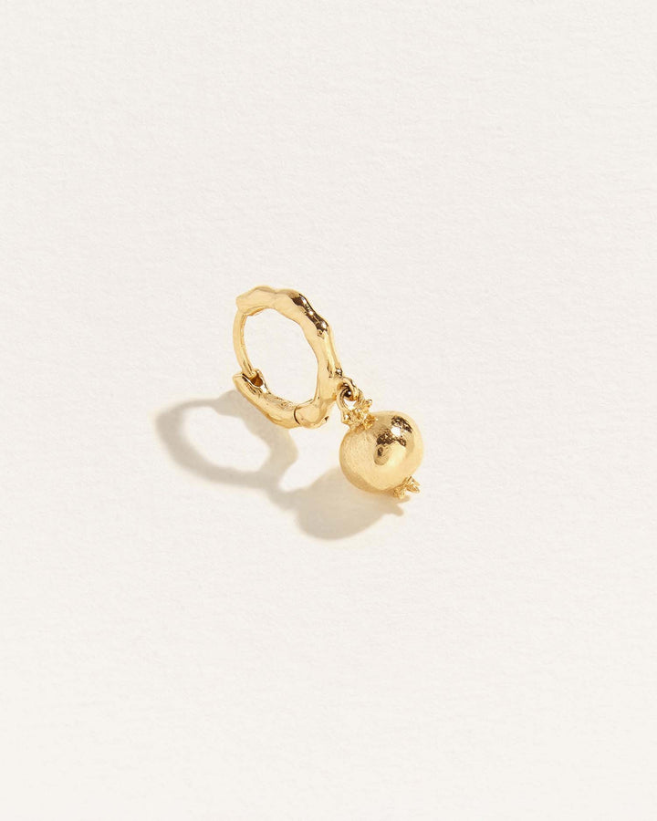 The Persephone Huggie by Pamela Love draws inspiration from the myth of the pomegranate, a symbol of abundance, transformation, and the cycle of renewal. A vividly detailed gold pomegranate charm—a nod to Persephone’s legendary journey to the underworld—suspends from a richly textured hoop. A piece that speaks to strength and rebirth, this huggie is perfect for those who love jewelry with a deeper meaning and an elegant edge. Ideal for lobe piercings. Sold as a single.