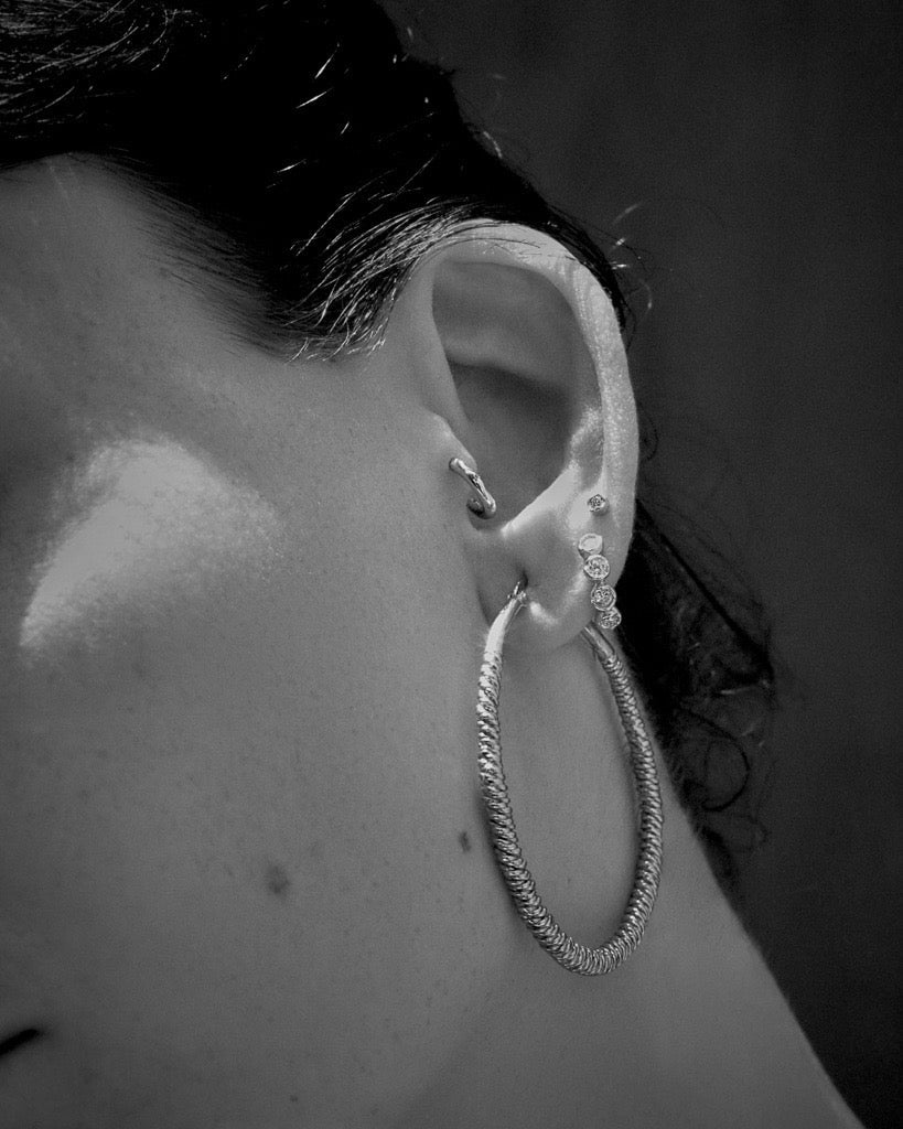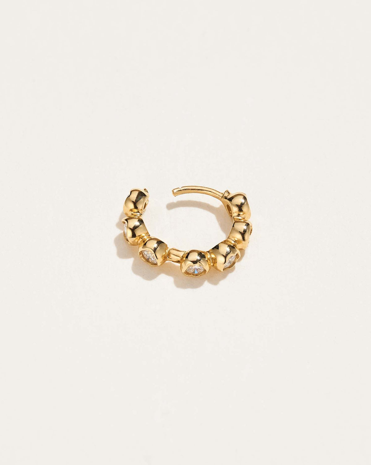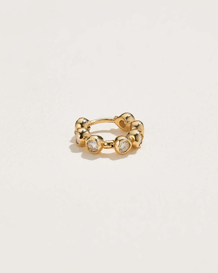 The Molten Stone Huggie in white diamond by Pamela Love is a modern take on the classic diamond hoop. Encased in organic molten bezels, each brilliant white diamond catches the light from every angle, adding radiance and depth to the piece. The sculptural gold setting elevates the traditional diamond huggie, making it versatile for both everyday elegance and curated ear styling.