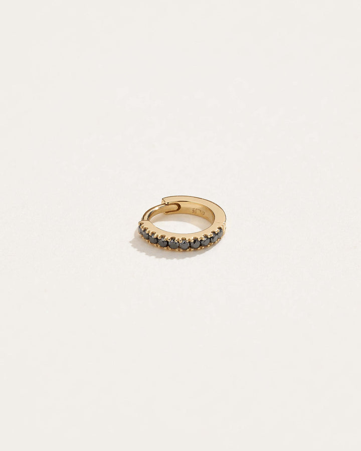 The 6mm Pavé Huggie in black diamond by Pamela Love is a bold and edgy take on the classic huggie. A sleek row of dark, enigmatic black diamonds creates an eye-catching contrast against the warm gold setting. The petite size and seamless clicker mechanism allow for a snug fit on the rook, helix, or lobe, making it a perfect choice for those who love understated yet striking jewelry.