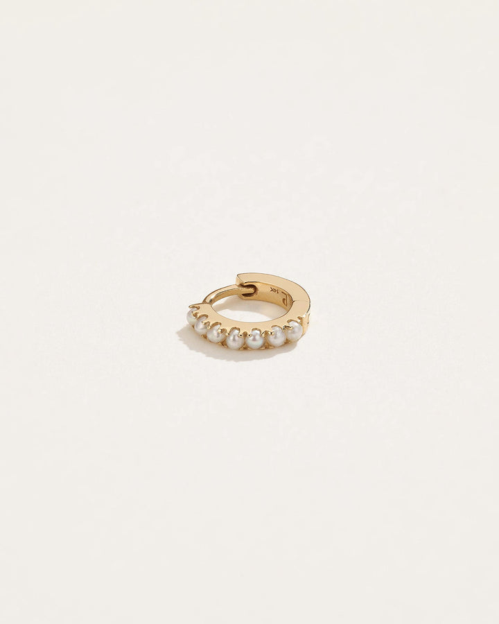 The 6mm Pavé Huggie in freshwater pearl by Pamela Love offers a timeless and ethereal charm. A delicate string of glowing pearls punctuates the huggie, adding an air of refined elegance to the piece. The classic shape and adjustable closure mechanism make it a perfect addition to any ear styling, whether placed on the rook, helix, or lobe.