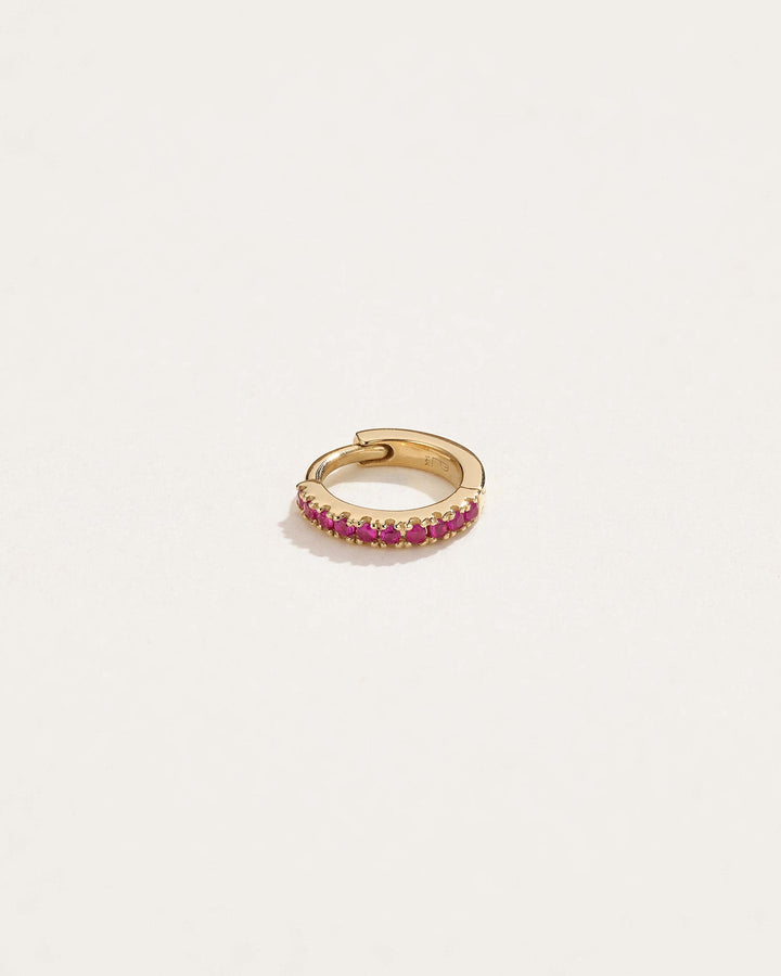 The 6mm Pavé Huggie in ruby by Pamela Love offers a fiery, luxurious touch to this classic design. A row of glowing rubies creates a striking contrast against the gold setting, making it ideal for those who seek elegance with a touch of passion. The adjustable closure ensures it can be styled on any piercing, from the lobe to the helix.