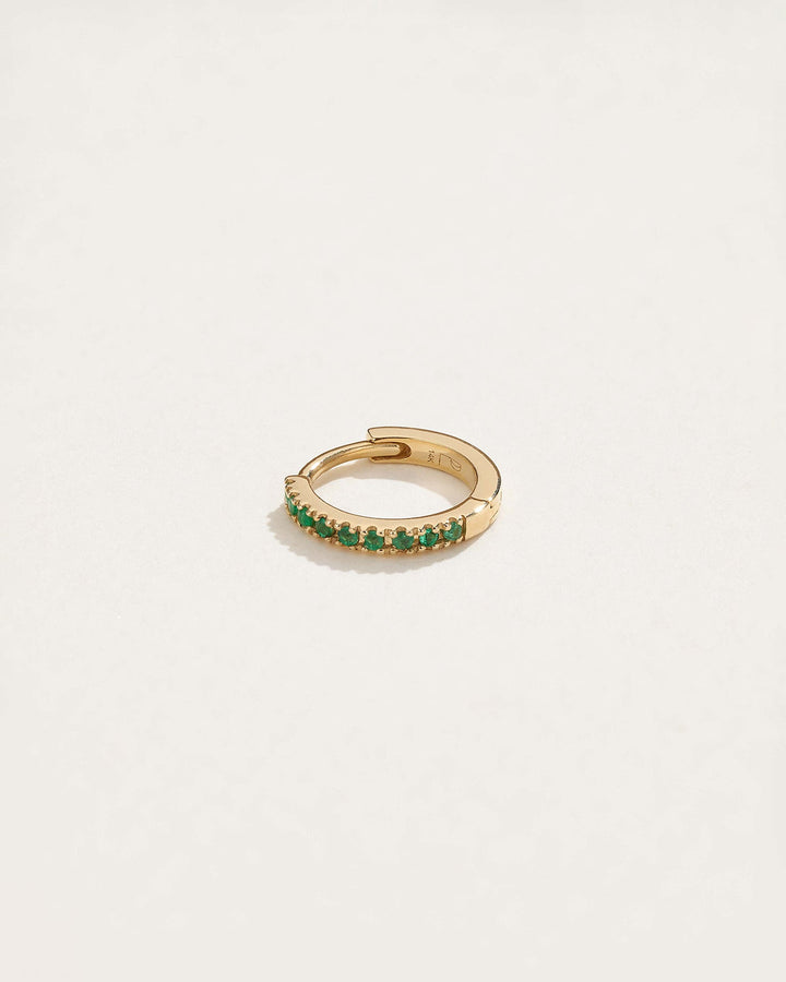 The 8mm Pavé Huggie in emerald by Pamela Love brings a vibrant burst of green through a delicate row of emeralds. Associated with growth and renewal, emeralds bring a sense of vitality and balance. This huggie makes a perfect statement piece on the lobe or helix, adding a touch of luxury and color to any piercing.
