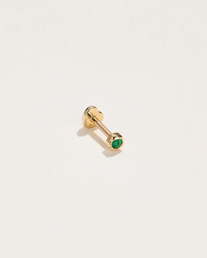 The Petite Nugget Stud in emerald by Pamela Love is a striking and versatile piece. A petite emerald is set in a molten gold bezel, creating a beautiful contrast of color and texture. Emeralds, known for symbolizing rebirth and love, add a subtle elegance to this delicate stud, making it perfect for tragus, helix, and flat piercings.