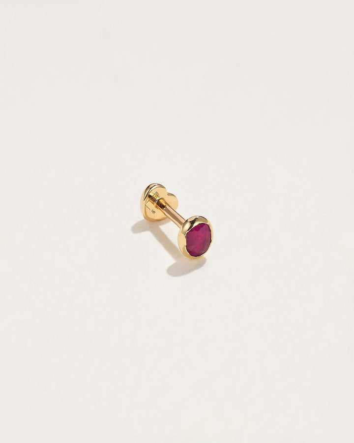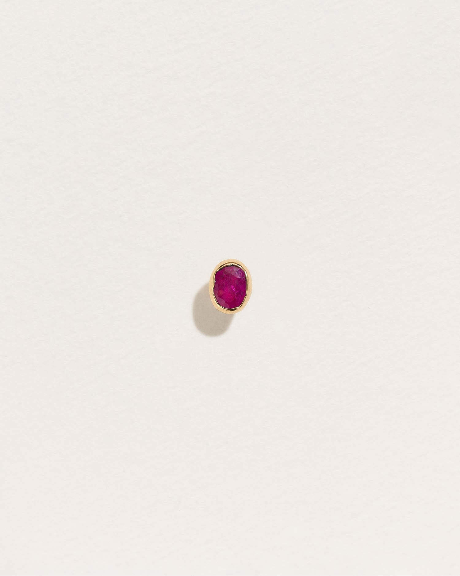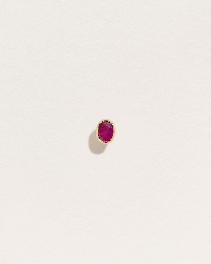 The Nugget Stud in ruby by Pamela Love features a stunning oval-shaped ruby set in a molten gold bezel. The ruby, a symbol of passion and vitality, gives this stud a bold and dynamic edge. Its unique profile is perfect for lobe, helix, and upper lobe piercings, making it a versatile piece that stands out.