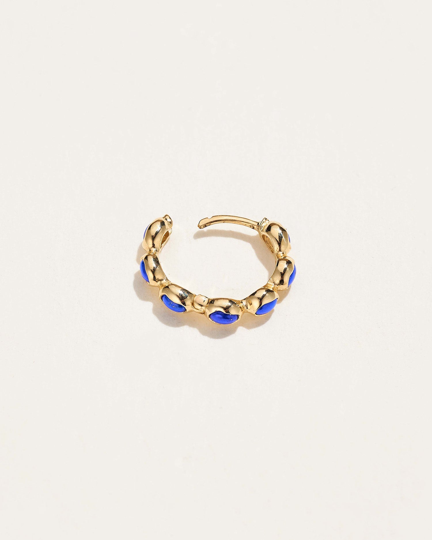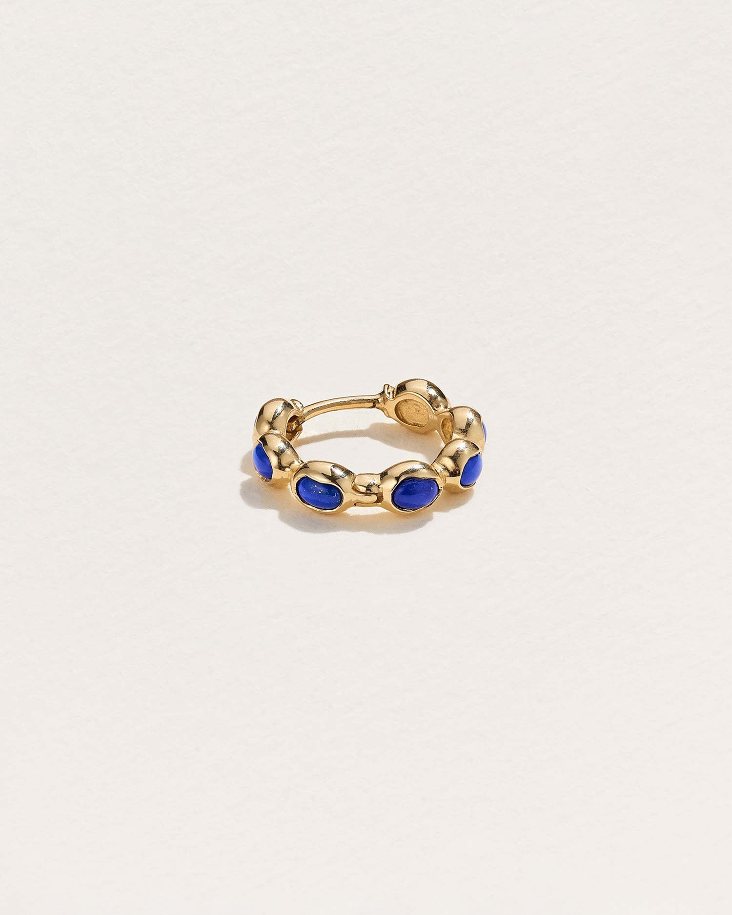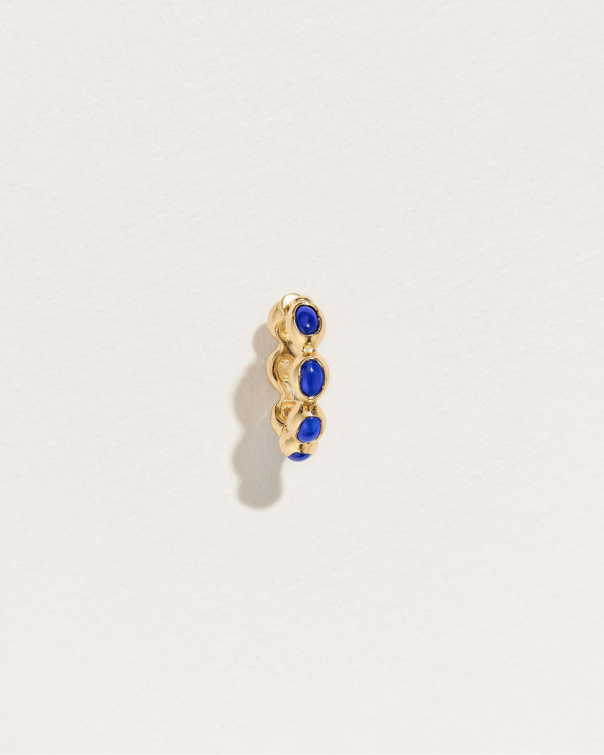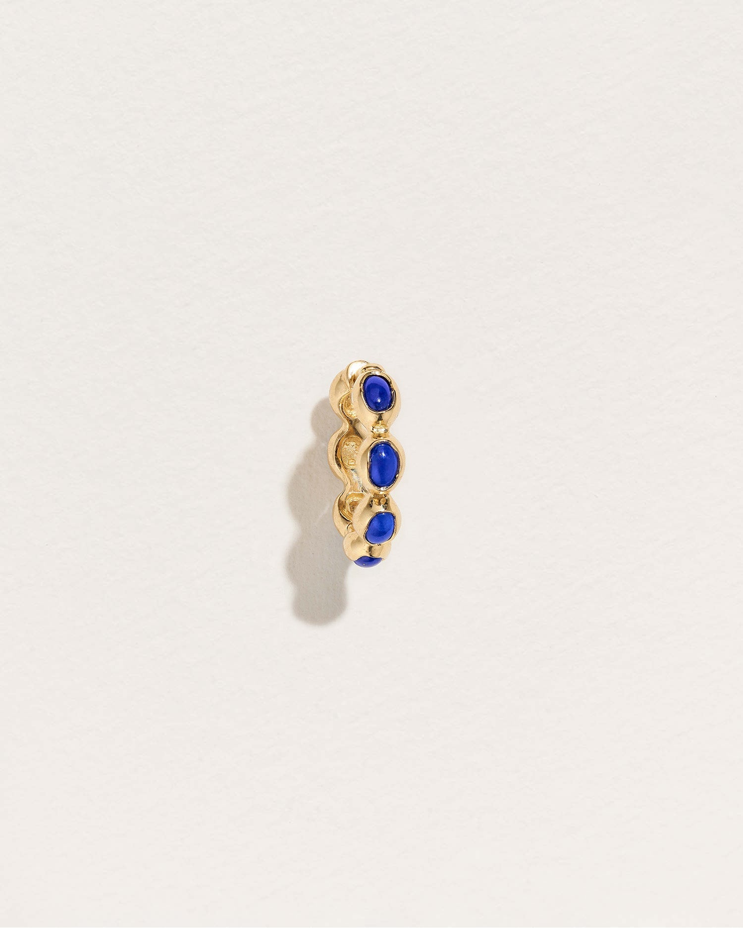 The Ovalado Huggie in lapis by Pamela Love features deep blue lapis cabochons set in a fluid molten gold hoop. The vibrant color of lapis, symbolizing wisdom and strength, enhances this huggie's ethereal design, making it ideal for conch, helix, and lobe piercings.