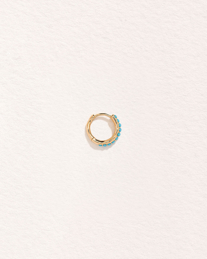 Handcrafted in 14k yellow gold with turquoise. Measures 10mm in inner diameter with a 19-gauge post. Features a hinge mechanism with a secure clicker closure.