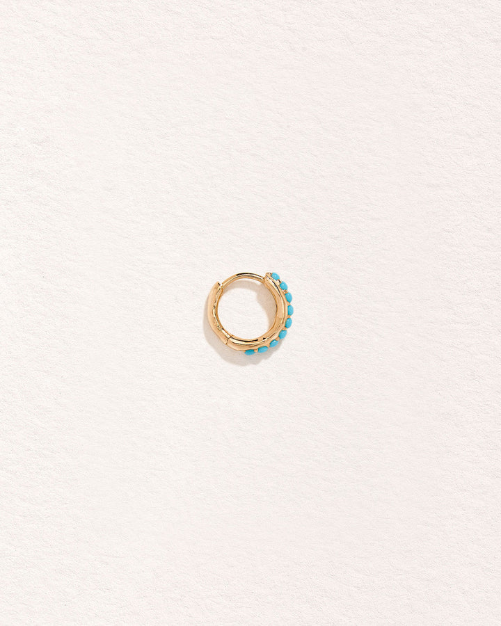 Handcrafted in 14k yellow gold with turquoise. Measures 8mm in inner diameter with a 19-gauge post. Features a hinge mechanism with a secure clicker closure.