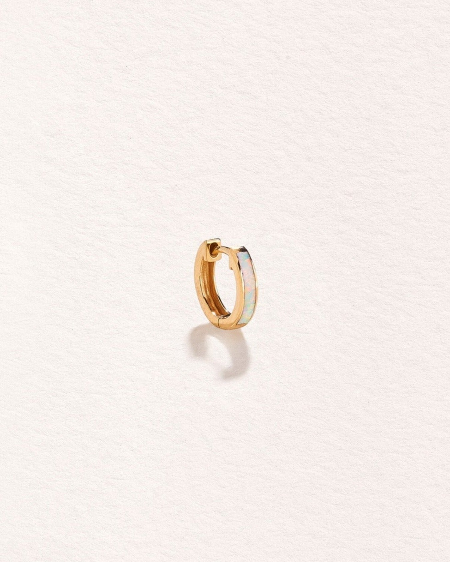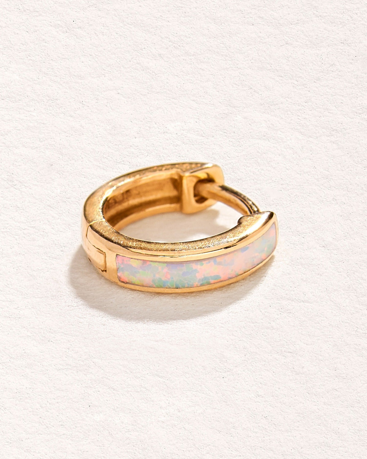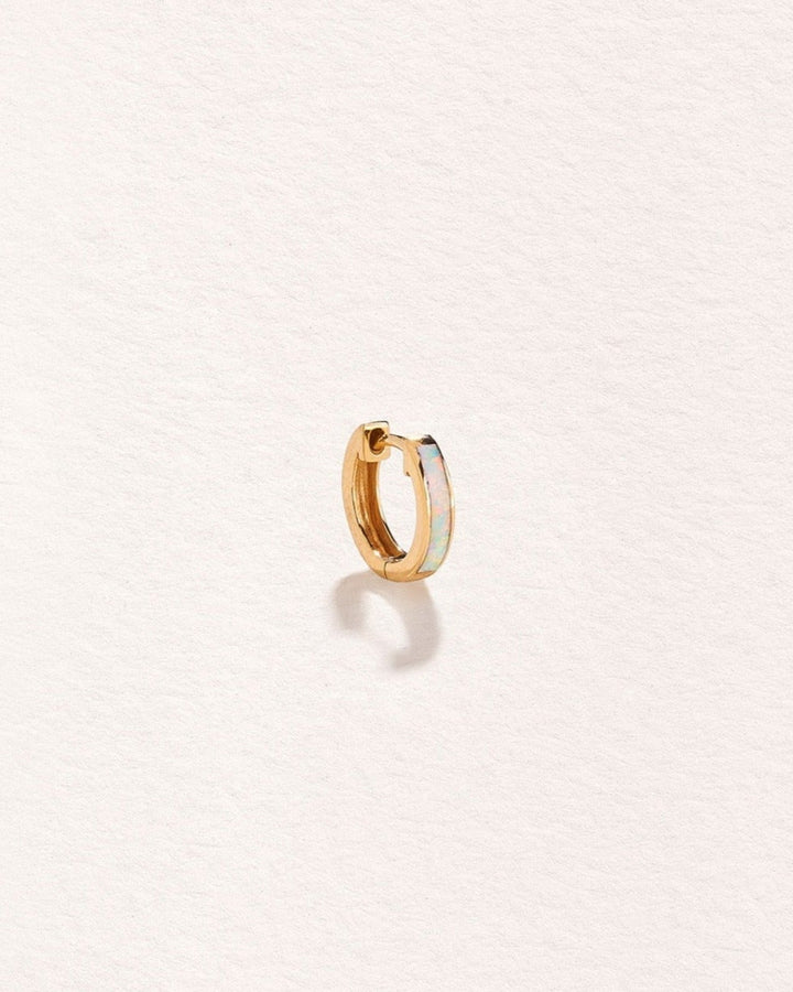 Handcrafted in 14k yellow gold with opal. Measures 13mm in outside diameter, 9mm in inside diameter, with a 5mm post length and a 19-gauge (0.95mm) clicker thickness. Features a hinge mechanism with a secure clicker closure.