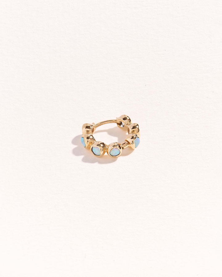 This Molten Stone Huggie by Pamela Love showcases a radiant row of opals, each encased in a molten bezel setting, creating a dynamic and fluid aesthetic. Ideal for conch, lobe, and helix piercings, this huggie balances organic elegance with contemporary edge. Sold as a single piece.