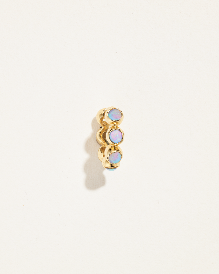 Handcrafted in 14k yellow gold with opals. Measures 10mm in inner diameter with an 18-gauge (1.2mm) threaded back post and a 6.5mm post length. Features an internally threaded heart-shaped ball back.