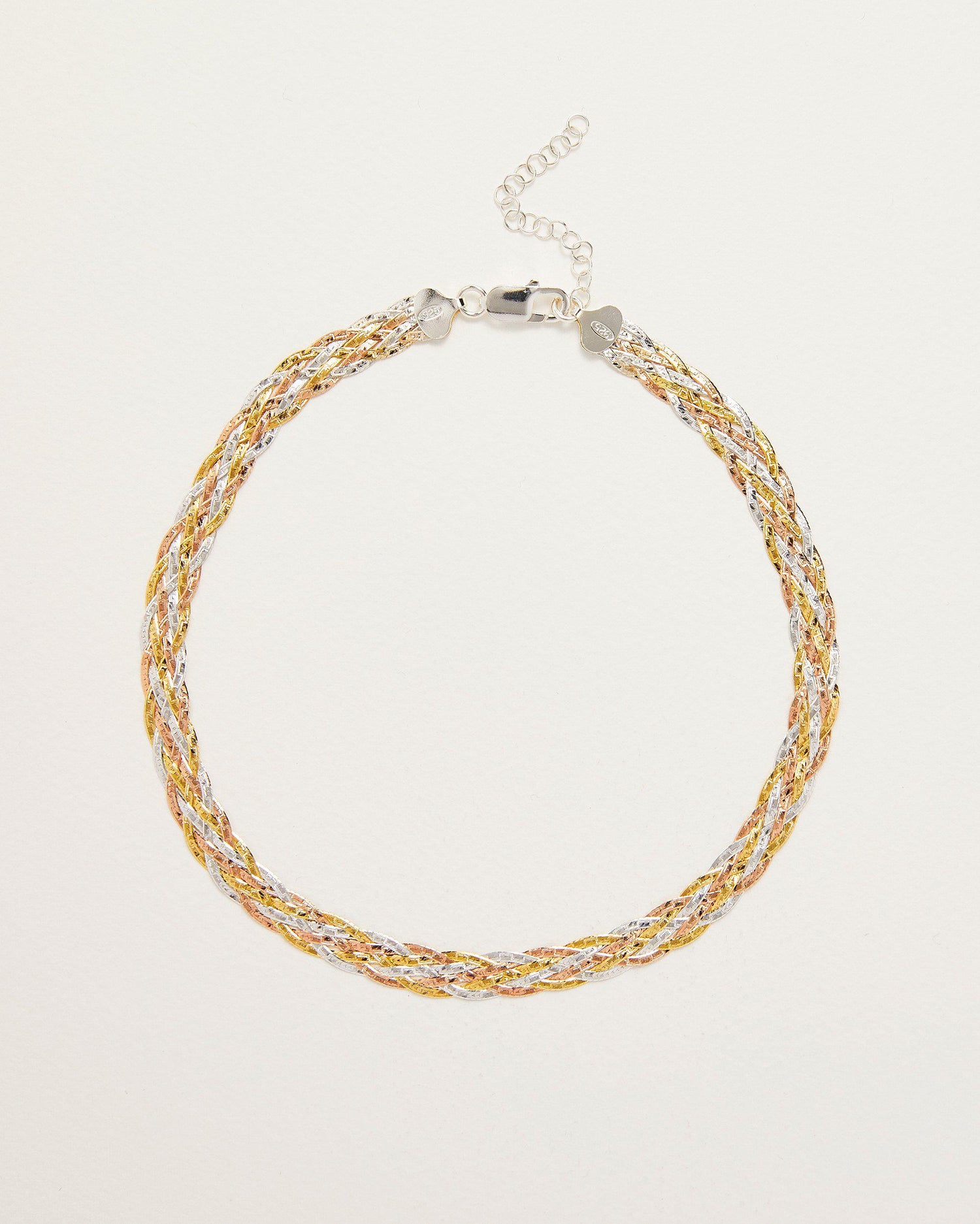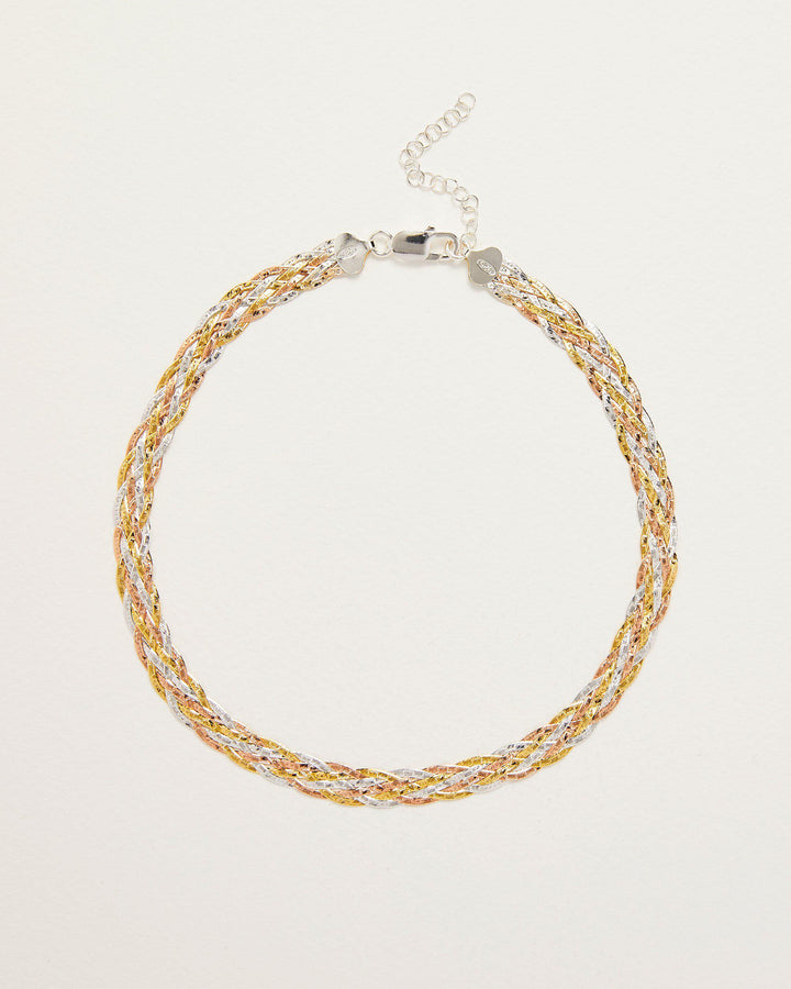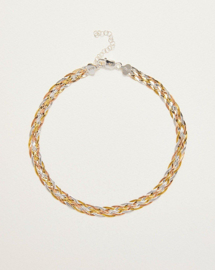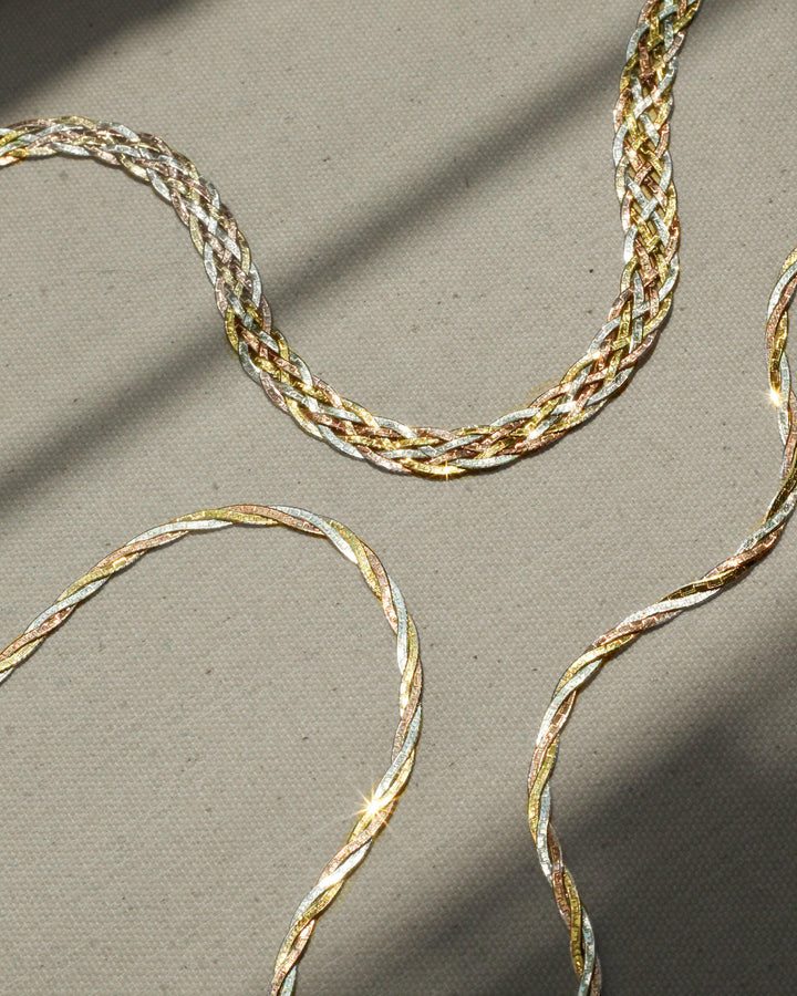 This Braided Tricolor Herringbone Thick Chain by Pamela Love is a beautifully textured necklace featuring delicately twisted strands of yellow, rose, and white gold. Made in Italy, this statement piece drapes elegantly along the collarbone and offers versatility with its high-polished and matte reversible finishes.
