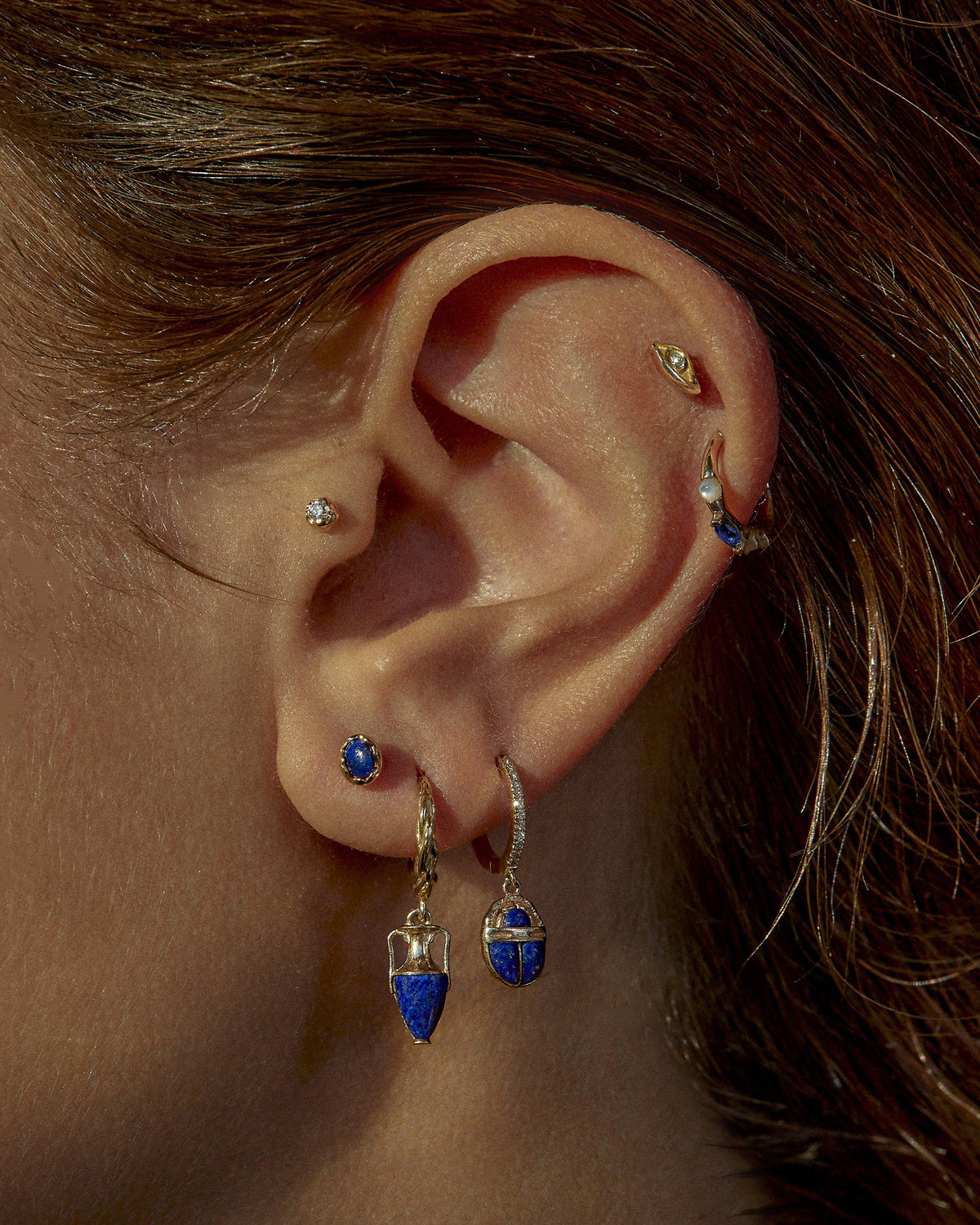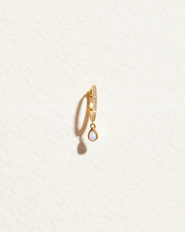 This Raindrop Pavé Huggie by Pamela Love features a dainty pavé huggie with a luminous opal raindrop, encased in 14k yellow gold. An elegant choice for adding subtle sparkle to lobe and helix piercings. Sold as a single piece.