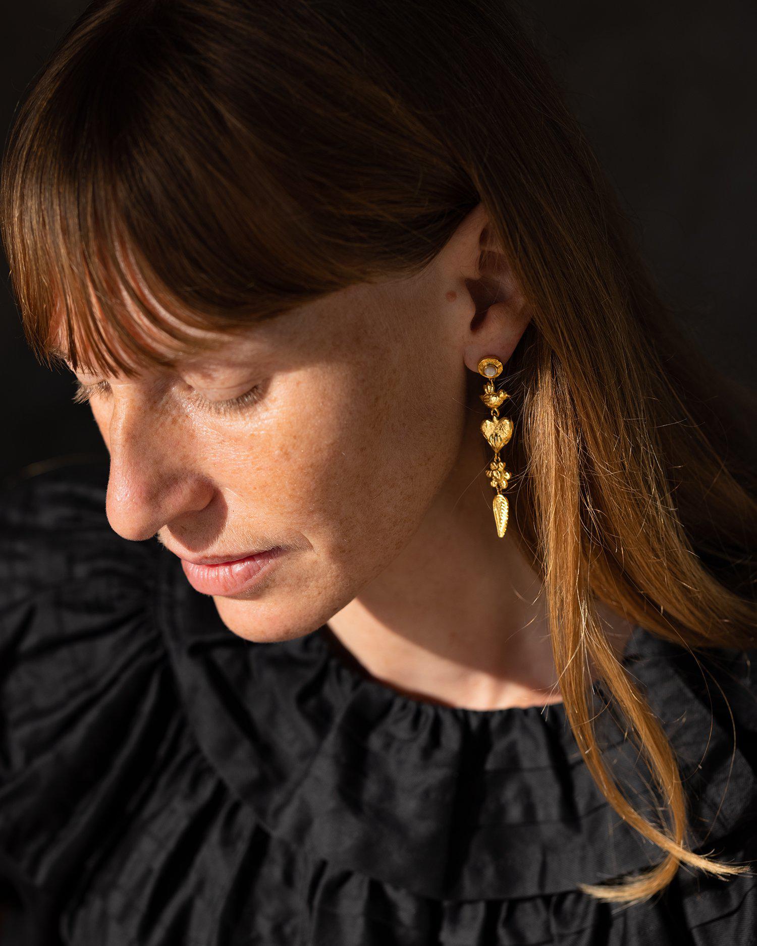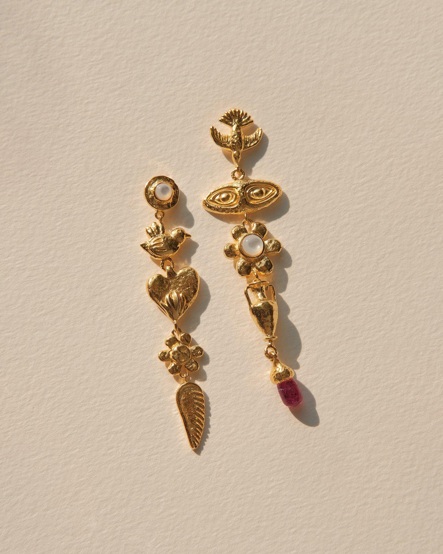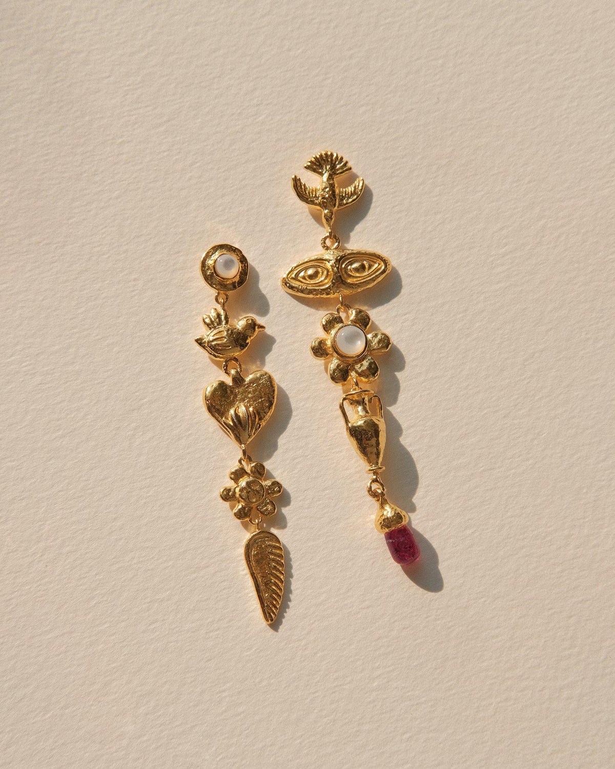 These Clara Earrings by Pamela Love are mismatched drop earrings inspired by ex-voto talismans from around the world. Featuring delicately textured gold charms adorned with freshwater pearls and a single deep red glass droplet, these statement earrings add a touch of symbolism and elegance.