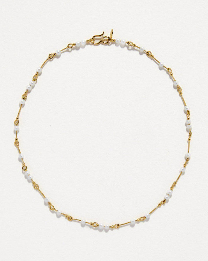 Crafted in 14k yellow gold plate over recycled brass with freshwater pearls. Measures 15 inches in length.