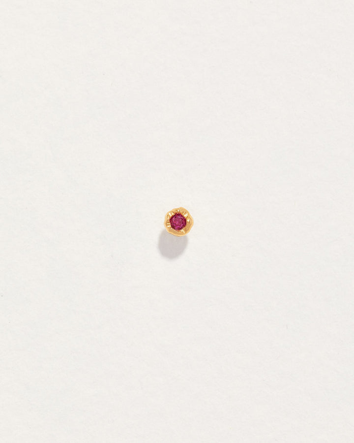 This Petite Nugget Stud by Pamela Love features a vibrant ruby encased in a molten 14k gold setting, offering a delicate yet organic texture. Designed for layering or as a subtle standalone accent, it's perfect for various piercings.