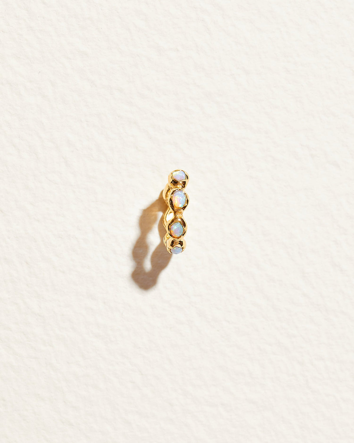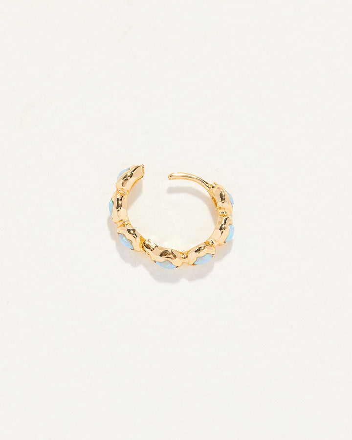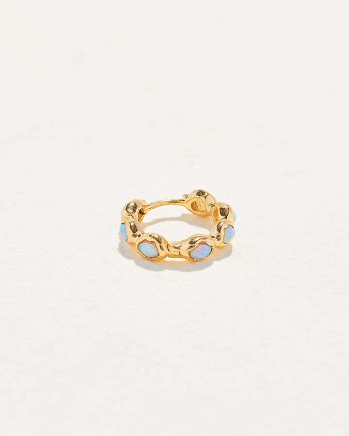 This Ovalado Huggie by Pamela Love showcases fiery opals set in a uniquely textured hoop, crafted in recycled 14k yellow gold. Its organic, irregular finish makes it an eye-catching choice for conch, helix, and lobe piercings.