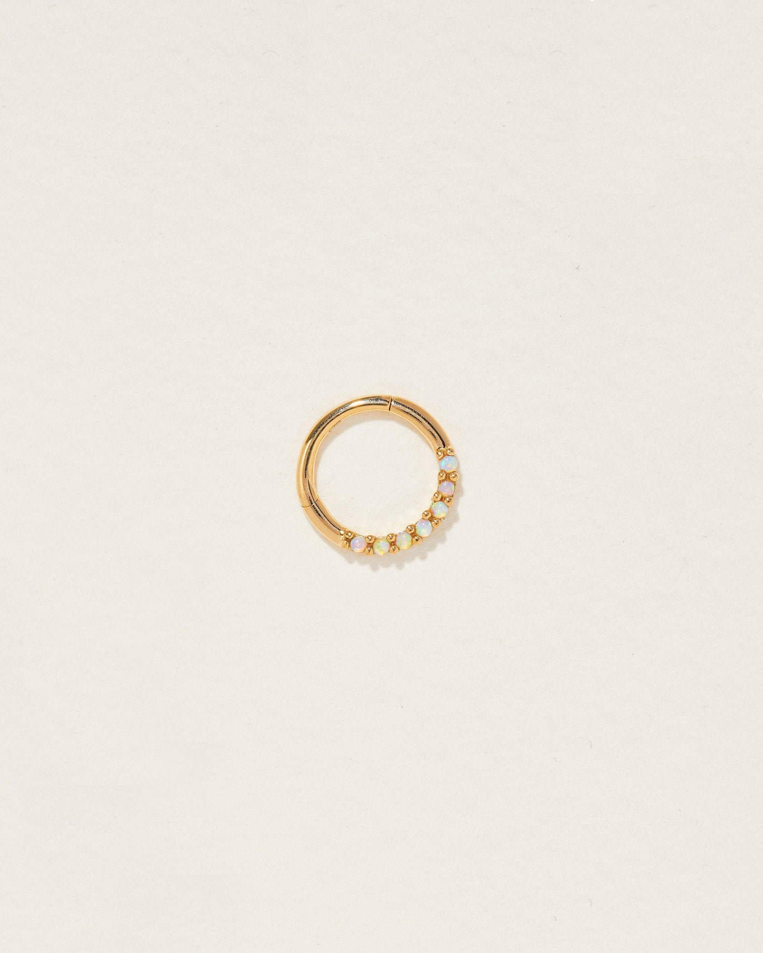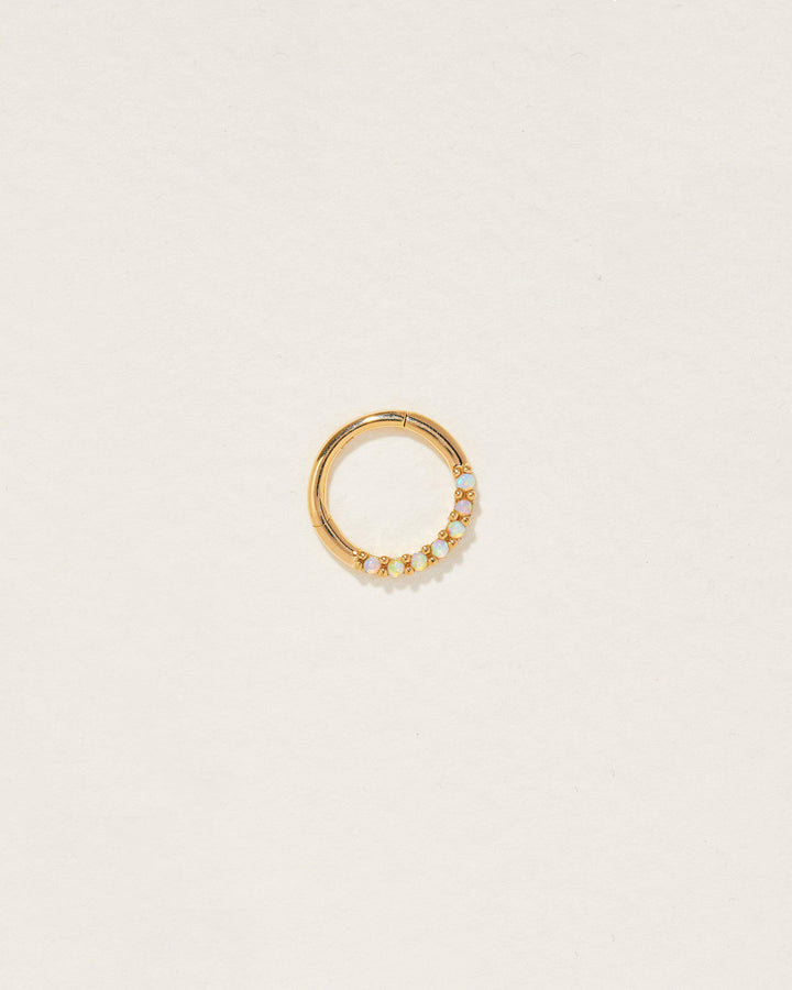 This Pavé Clicker by Pamela Love is a delicate hoop featuring front-facing fiery Gilson opal cabochons. Handcrafted in recycled 14k yellow gold, it is an elegant option for daith, septum, and helix piercings.
