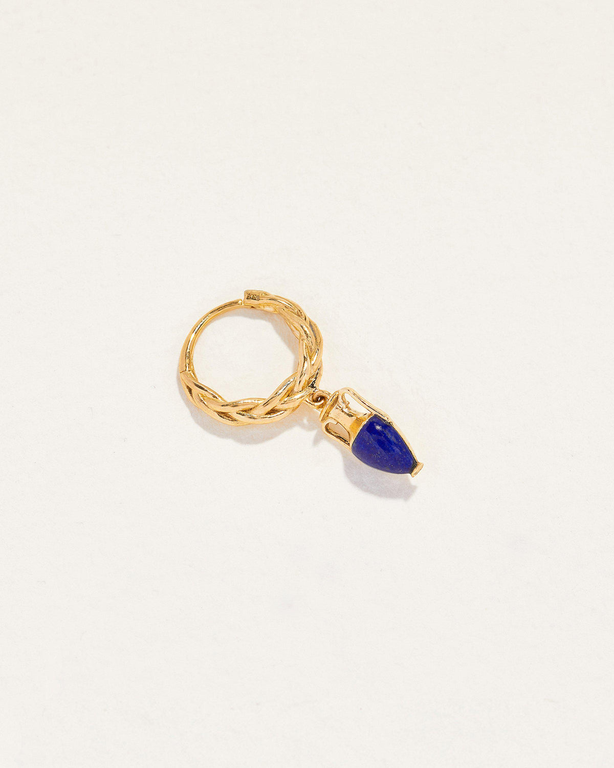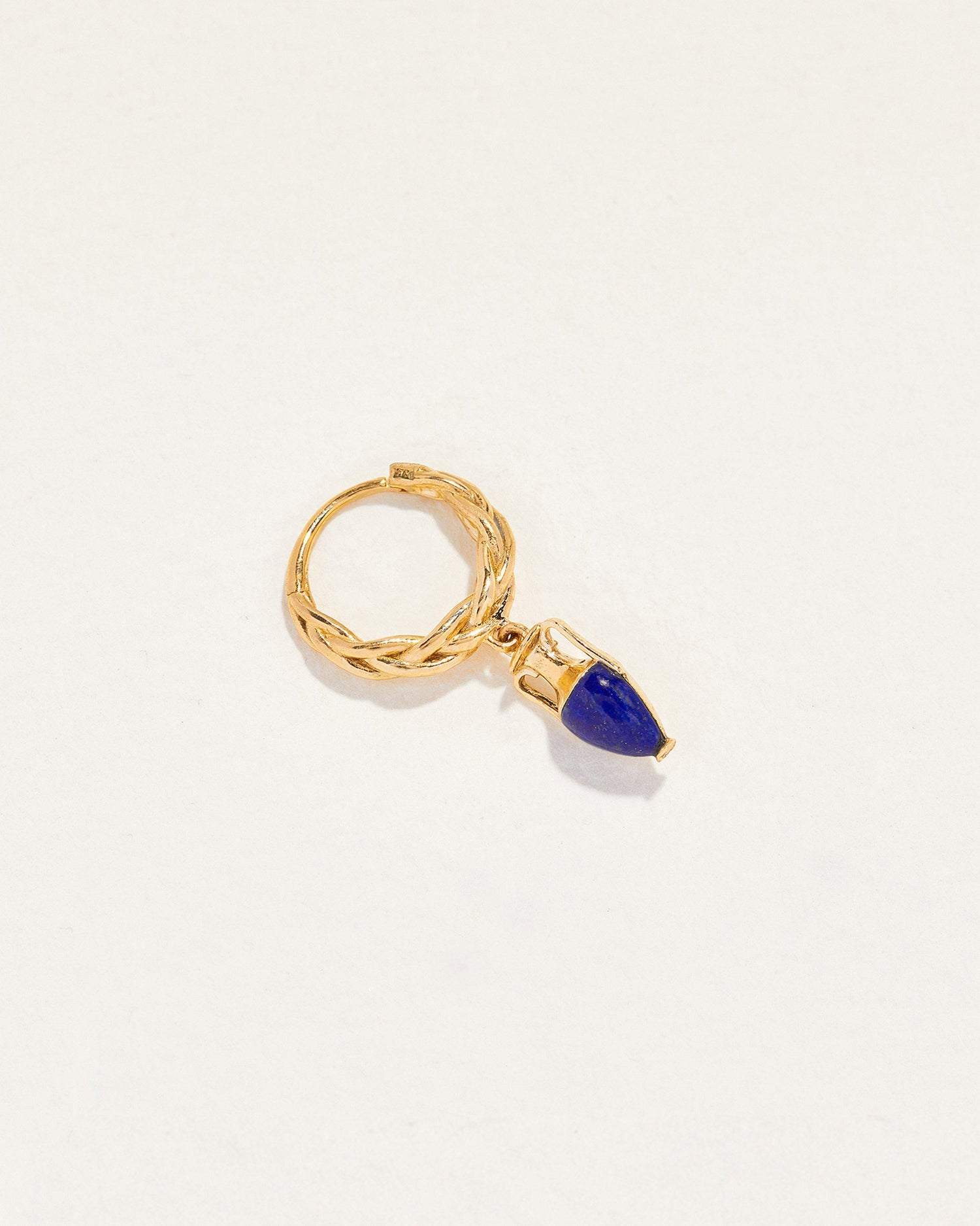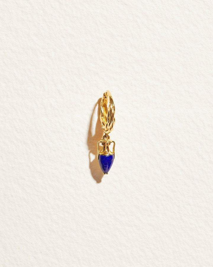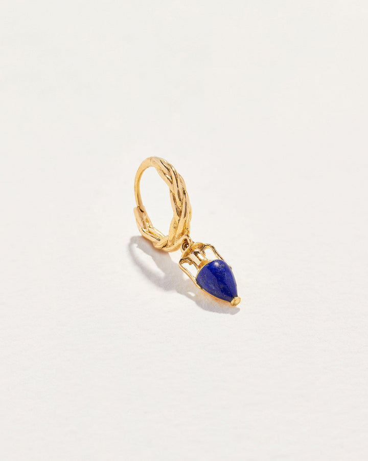 This Inlay Vessel Huggie by Pamela Love features a hand-carved vessel charm with vibrant lapis inlay, suspended from a delicately braided organic hoop in recycled 14k gold.