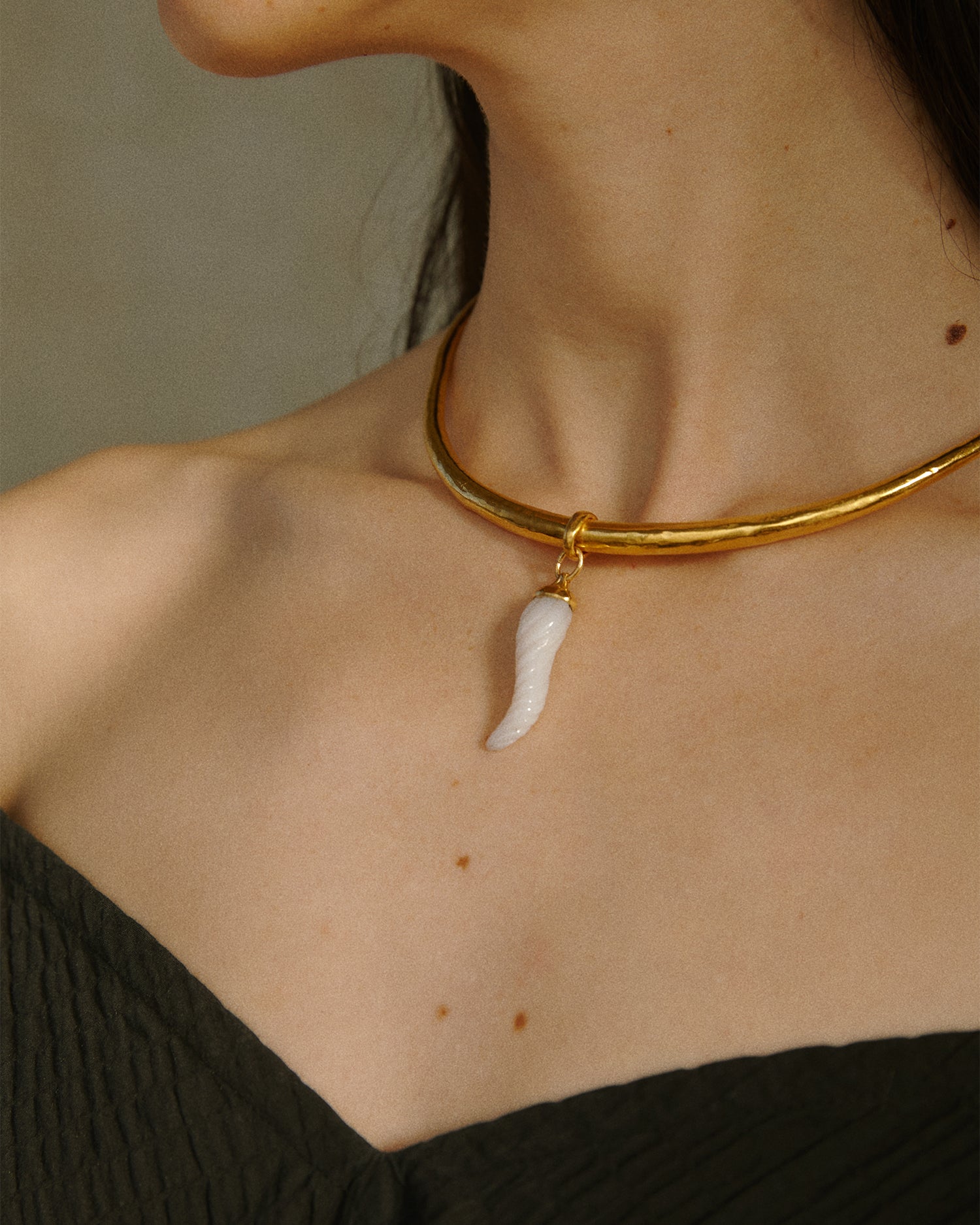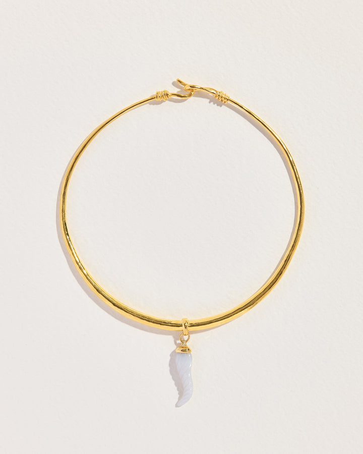 This Horn Collar by Pamela Love draws inspiration from the mystical fauns of mythology, magical forest guides believed to bring wisdom and good fortune. The hand-carved stone horn rests elegantly along the collarbone, making a striking statement piece steeped in symbolism.