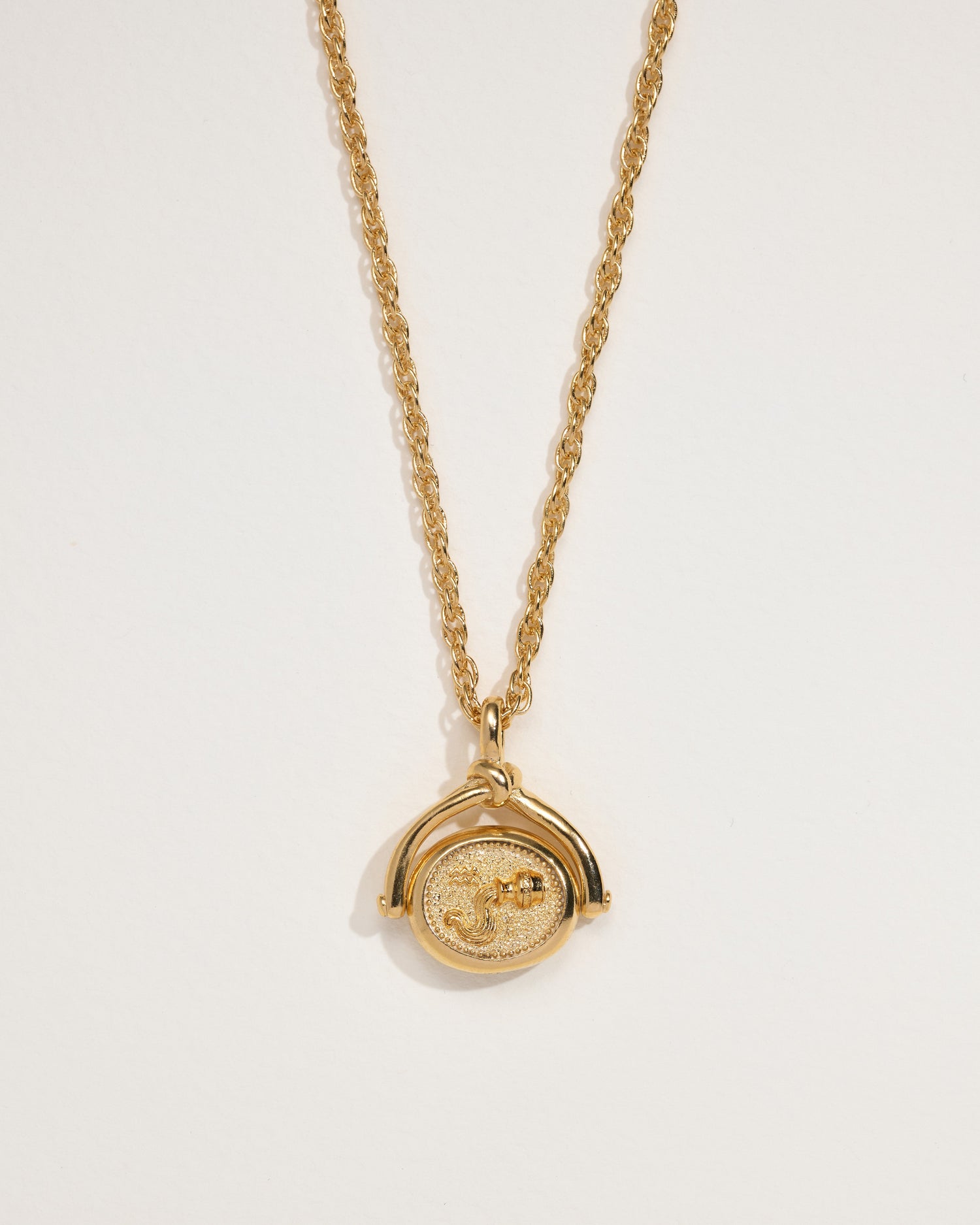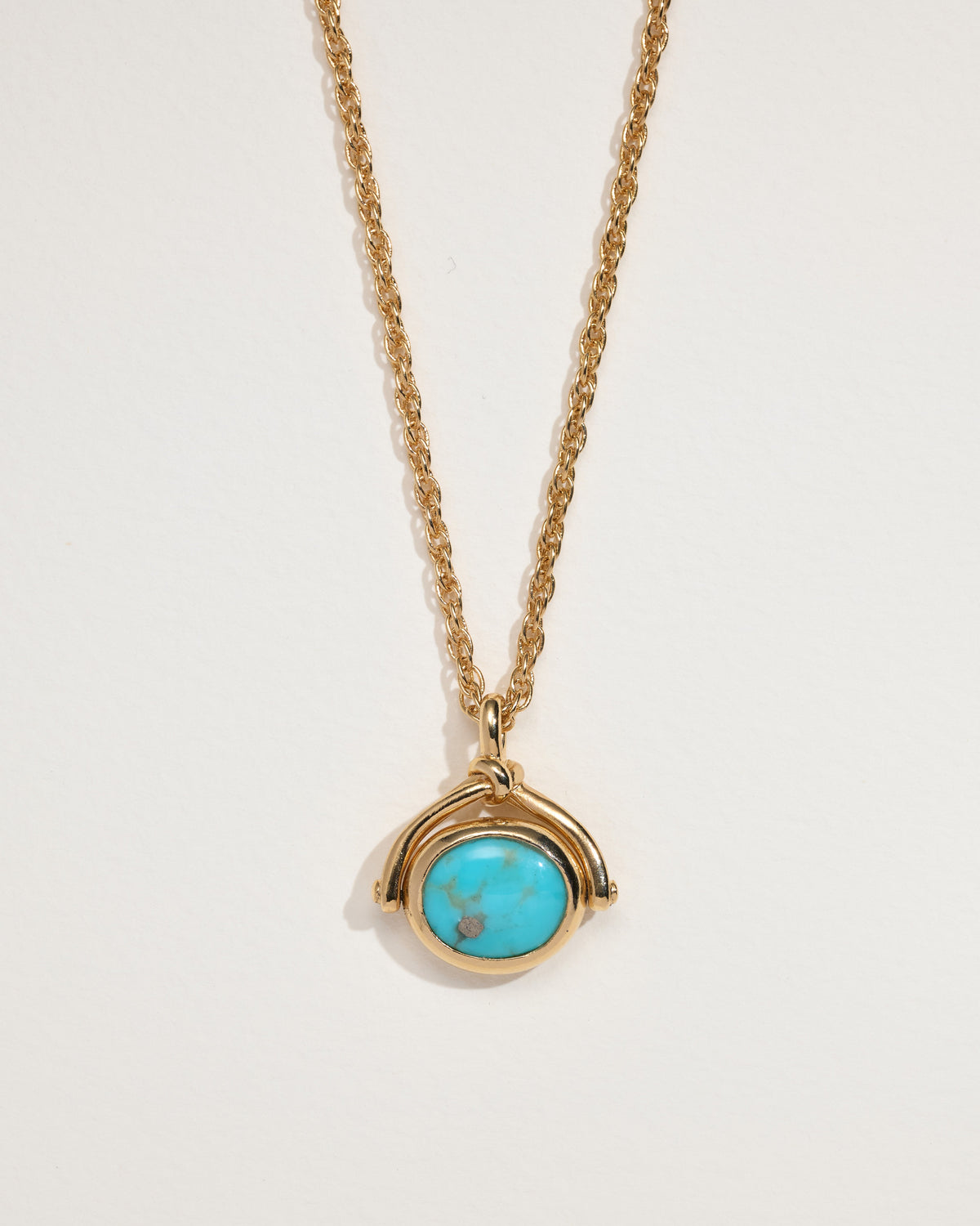 This Aquarius Spinner Pendant by Pamela Love celebrates the free-spirited nature of the Aquarius sign. The two-sided spinner pendant features an intricate astrological motif on one side and a breezy sky blue turquoise coin on the other, symbolizing air and intuition.