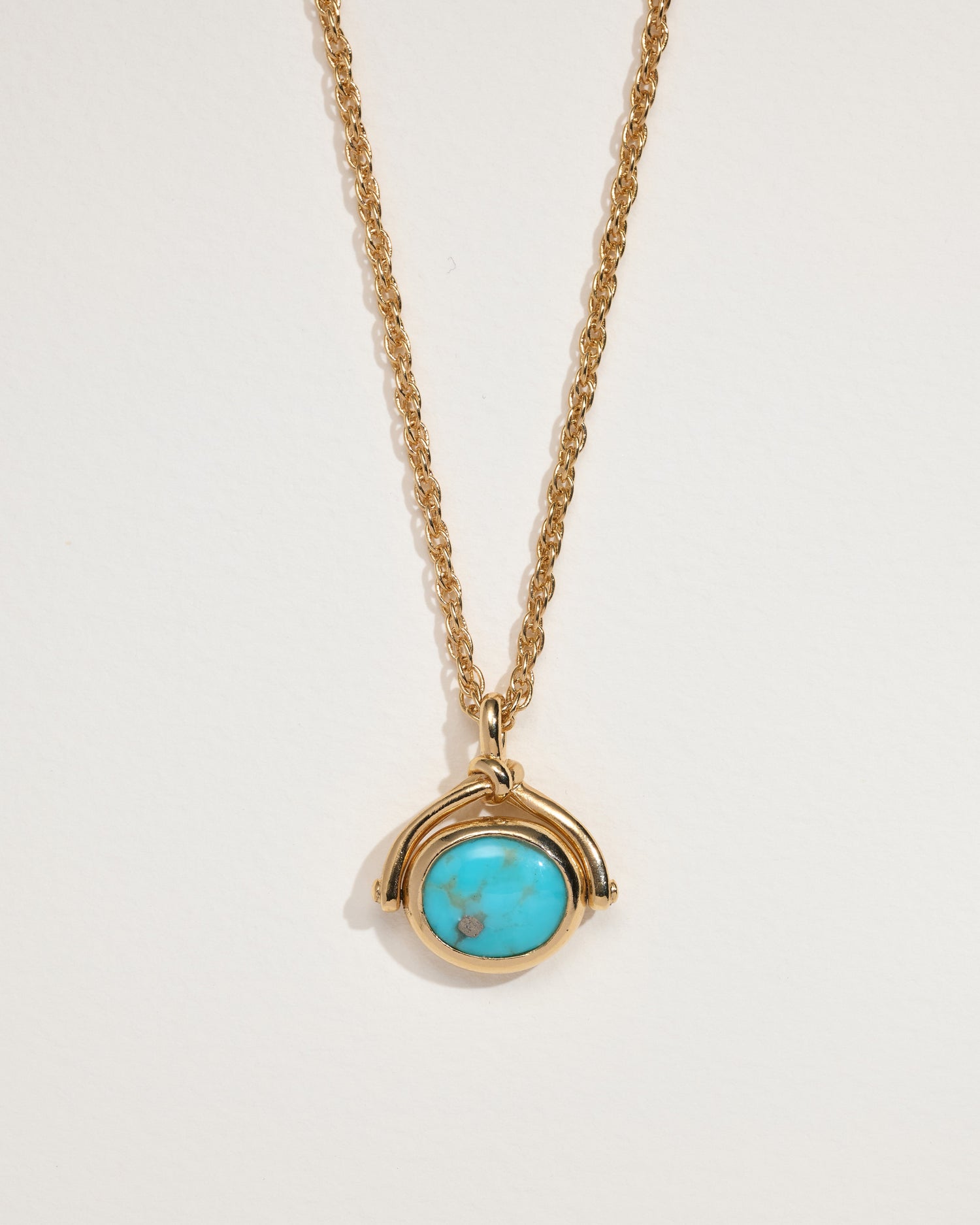 Gold-plated over brass, turquoise. Chain: 18 inches, pendant width: 15 mm.