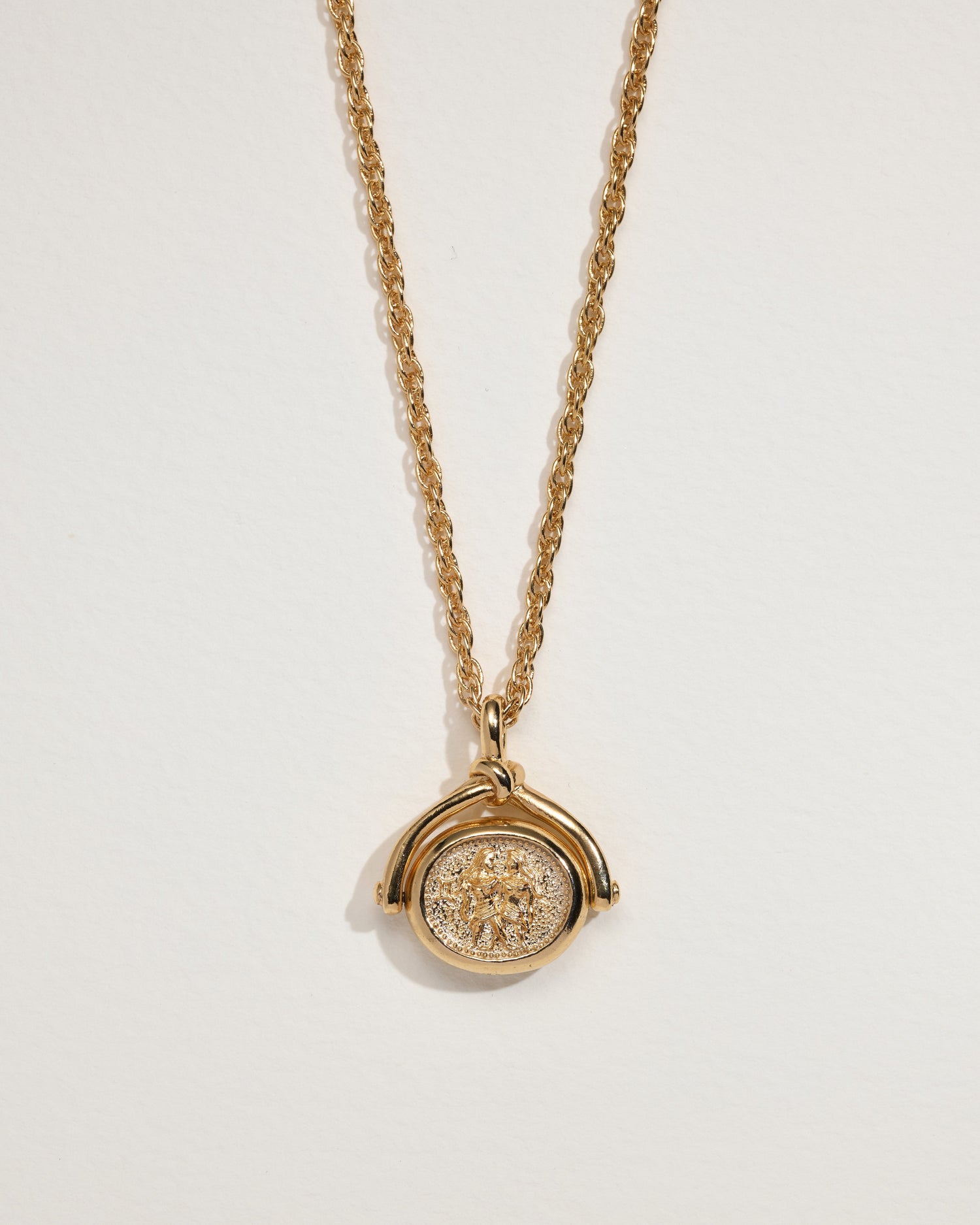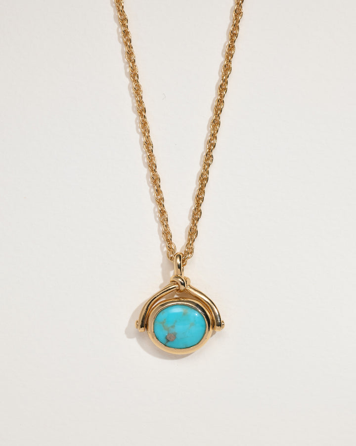 This Gemini Spinner Pendant by Pamela Love captures the dynamic and versatile nature of the Gemini sign. One side of the pendant showcases an astrological engraving, while the reverse features a tranquil sky blue turquoise coin, representing duality and adaptability.