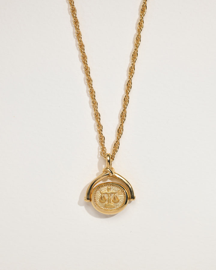 This Libra Spinner Pendant by Pamela Love is a tribute to the balanced and harmonious energy of Libra. Featuring a two-sided design, one side is adorned with the Libra zodiac motif, while the other showcases a calming sky blue turquoise coin, embodying serenity and equilibrium.