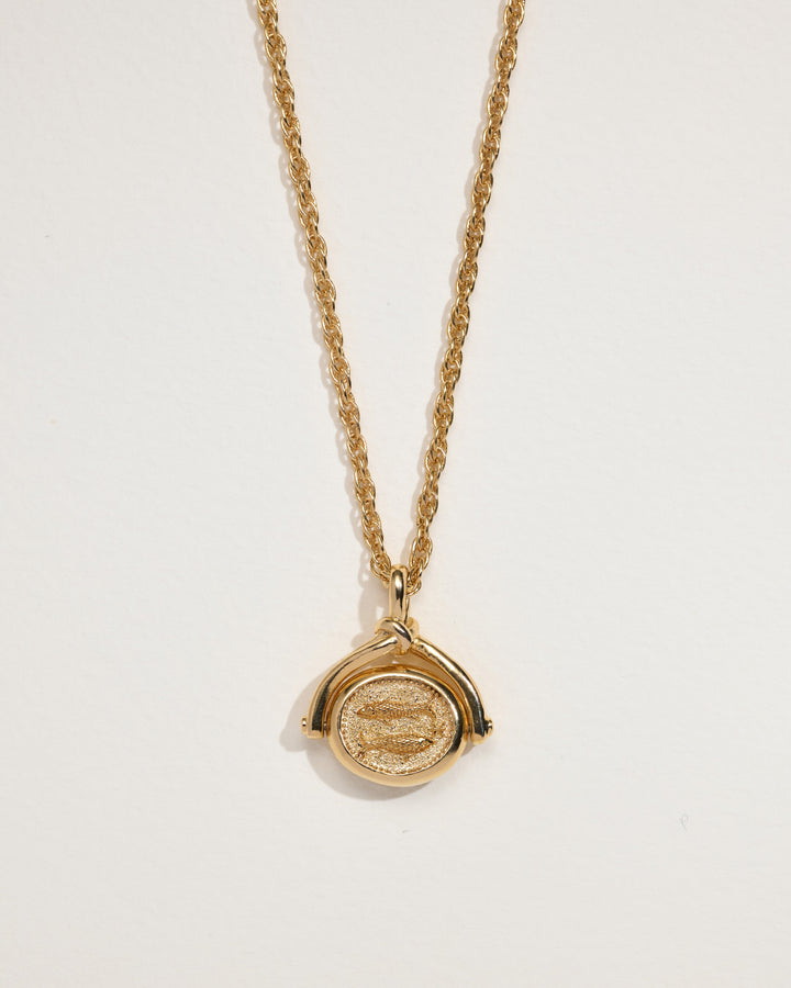 This Pisces Spinner Pendant by Pamela Love is a celestial tribute to the intuitive and emotional nature of Pisces. The pendant’s two-sided design features a Pisces zodiac engraving on one side and a deep ocean blue lapis coin on the other, evoking the sign’s deep connection to water and spirituality.