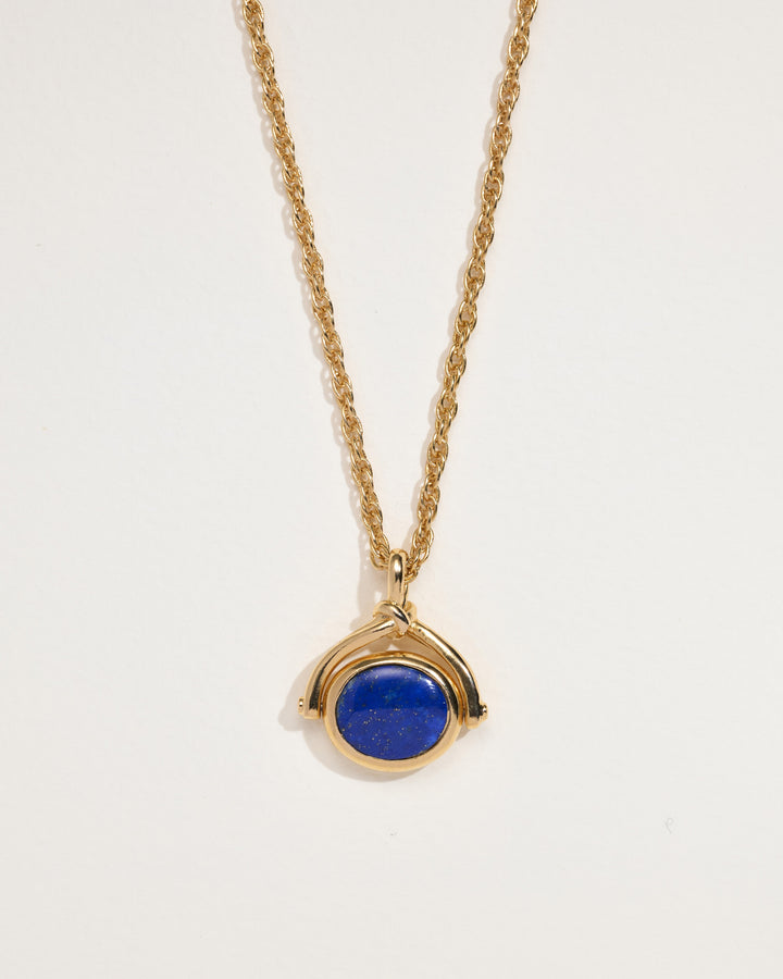 Gold-plated over brass, lapis. Chain: 18 inches, pendant width: 15 mm.