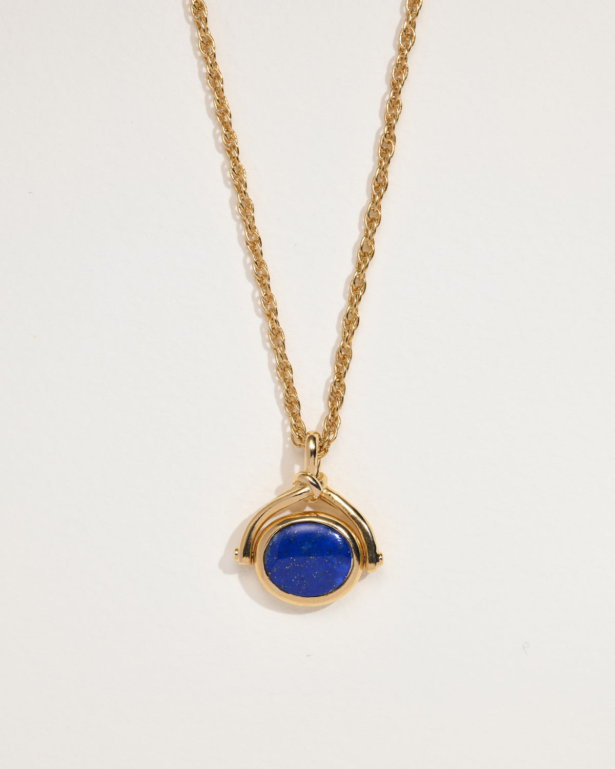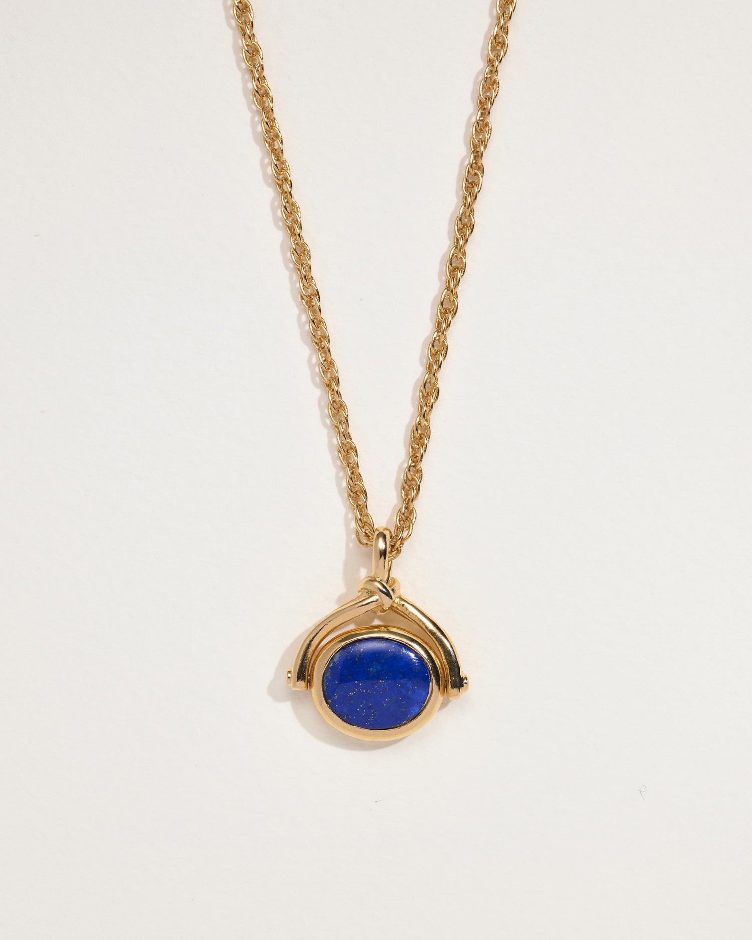 Gold-plated over brass, lapis. Chain: 18 inches, pendant width: 15 mm.