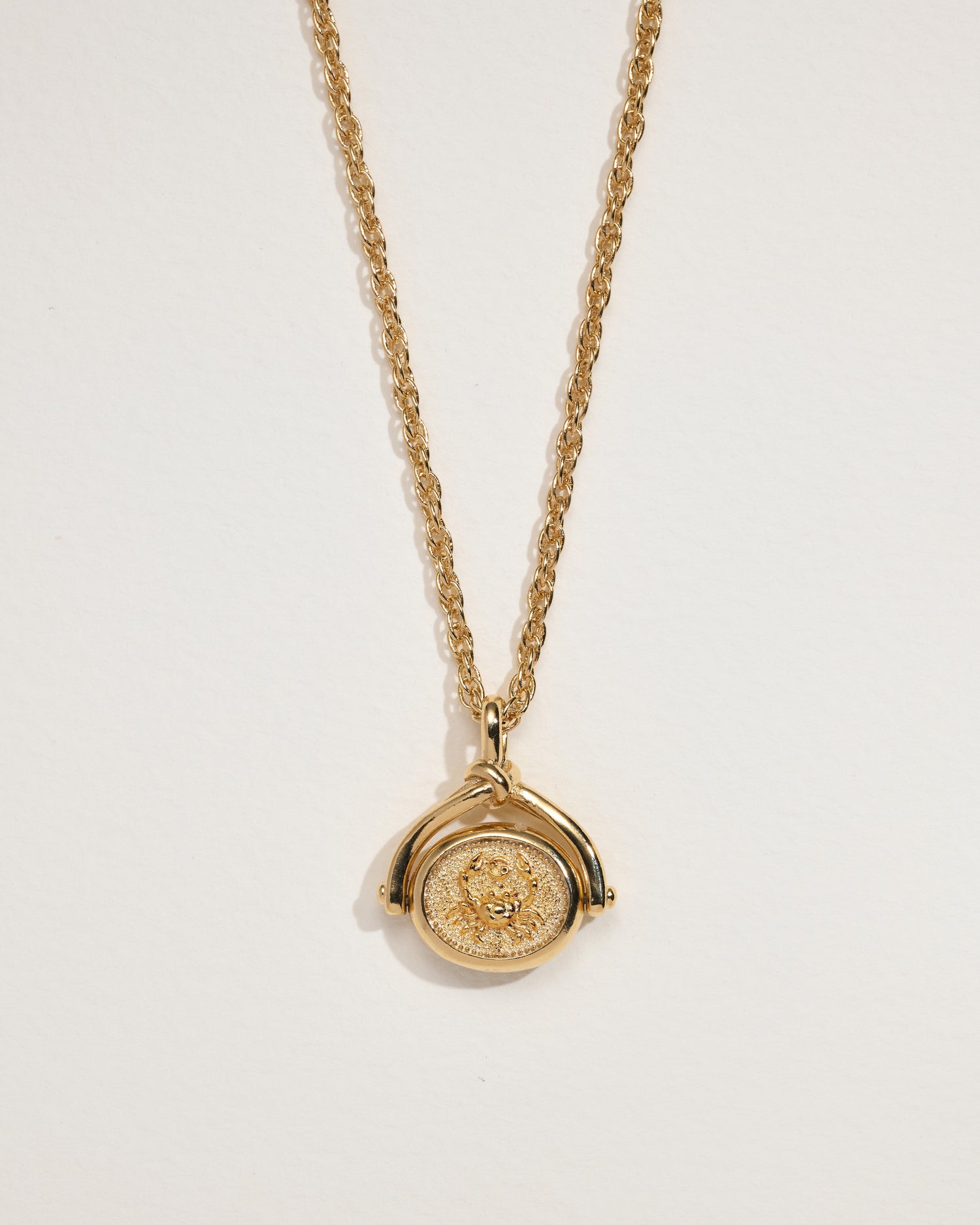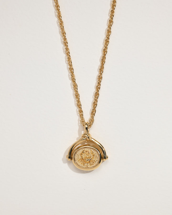 This Cancer Spinner Pendant by Pamela Love embraces the nurturing and emotional essence of the Cancer zodiac. One side of the pendant bears the Cancer astrological motif, while the other features a rich ocean blue lapis coin, symbolizing intuition and depth.