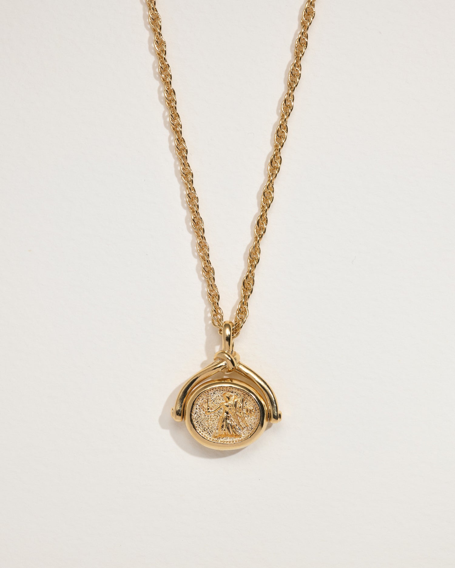 This Virgo Spinner Pendant by Pamela Love embodies the practical and detail-oriented nature of Virgo. The pendant features an engraved Virgo zodiac motif on one side and a vibrant green malachite coin on the other, symbolizing wisdom and growth.