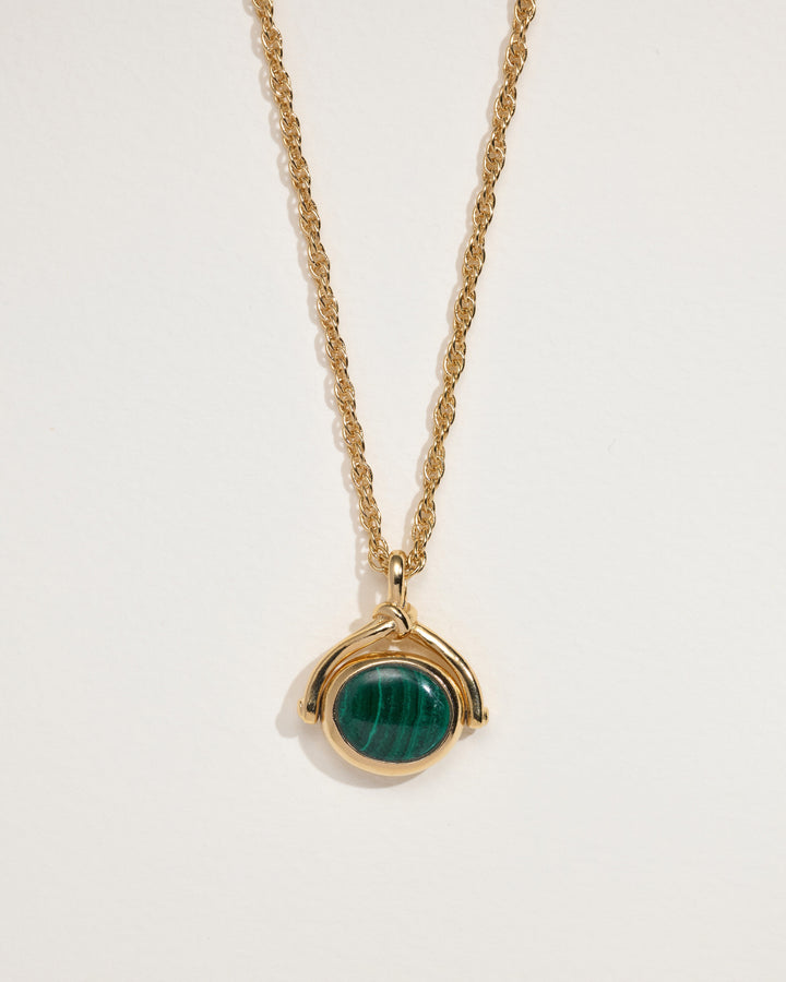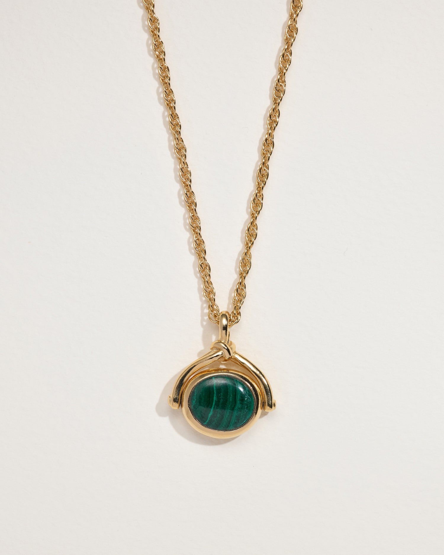 Gold-plated over brass, malachite. Chain: 18 inches, pendant width: 15 mm.