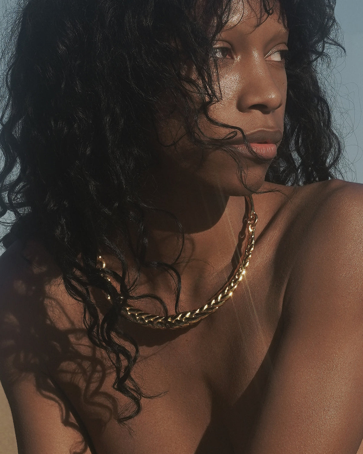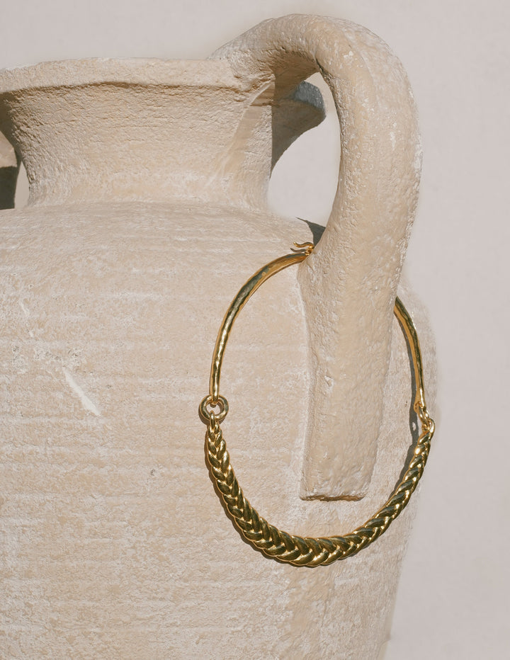 This Helia Collar by Pamela Love is a bold yet intricate piece, featuring a plaited golden design that balances the strength of armor with the softness of woven textiles. Its structured yet fluid form makes it a striking addition to any collection.