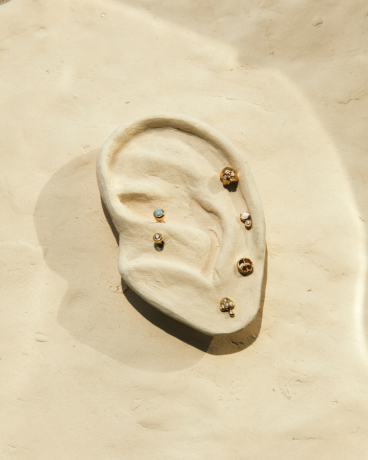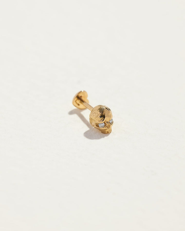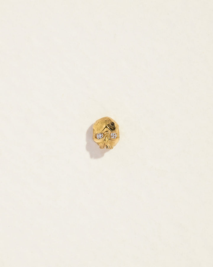 This Memento Mori Stud by Pamela Love is a symbolic tribute to mortality and transformation. A petite hand-carved skull with glittering diamond eyes offers a refined yet edgy accent to any piercing curation. Sold as a single.