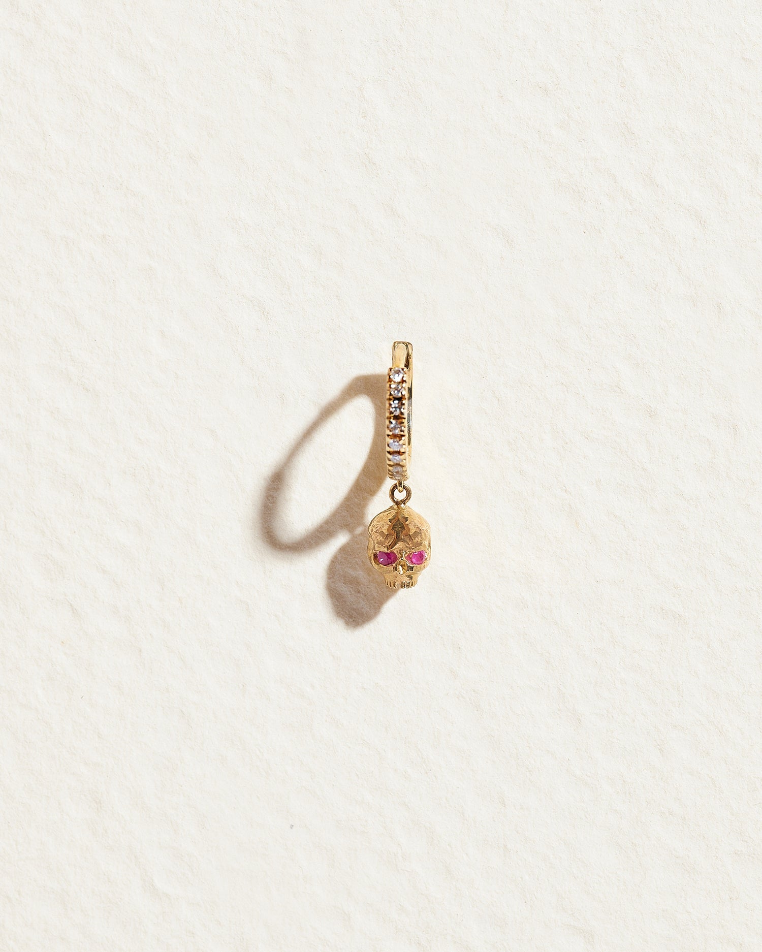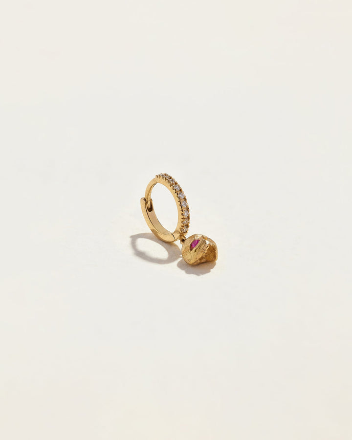 This Pavé Memento Mori Huggie by Pamela Love combines the elegance of pavé diamonds with the rebellious edge of a skull motif. A petite hand-carved skull with fiery ruby eyes dangles from a 14k gold huggie lined with pavé diamonds, making for a striking and symbolic piece. Sold as a single.