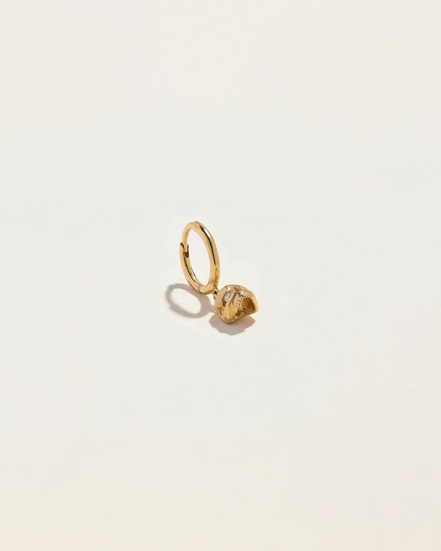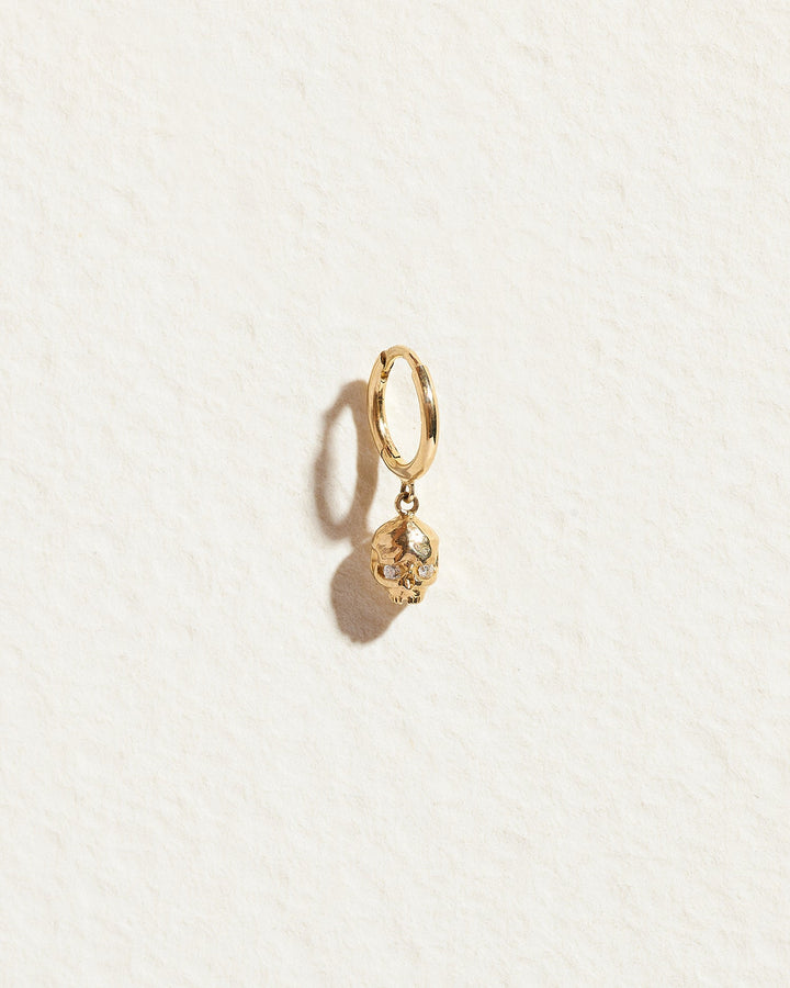 This Memento Mori Huggie by Pamela Love is an artful fusion of symbolism and sophistication. A petite hand-carved skull with shimmering diamond eyes is suspended from a 14k gold huggie, adding an unexpected yet timeless statement to any look. Sold as a single.