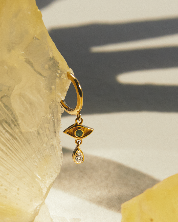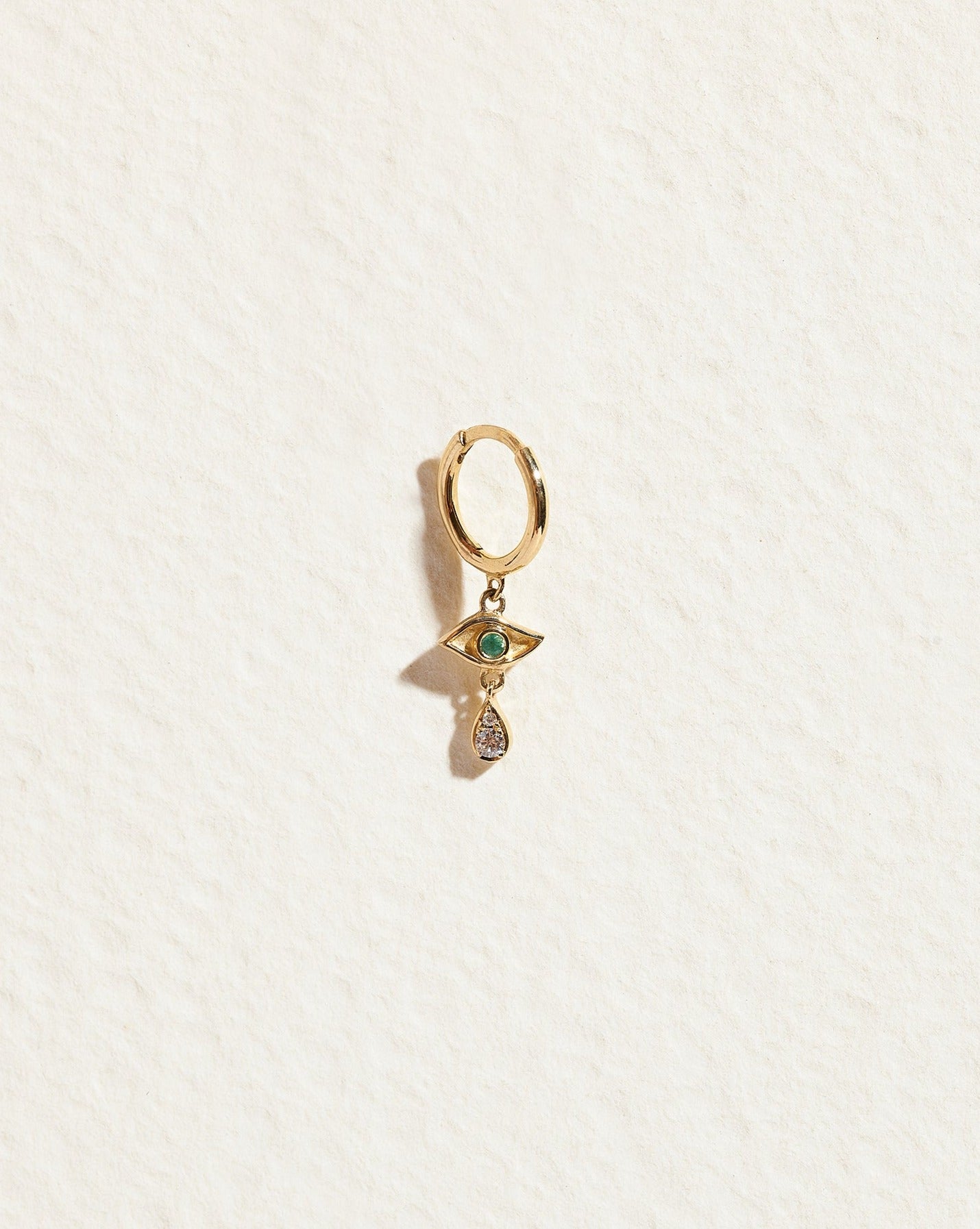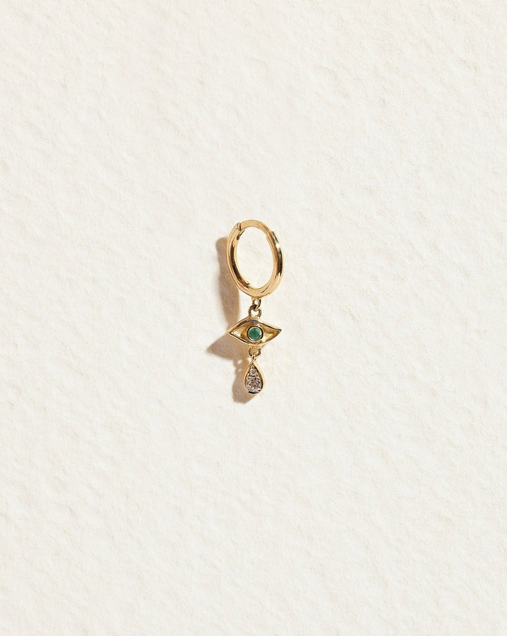 This Crying Eye Huggie by Pamela Love takes an iconic symbol and transforms it into a statement of both protection and beauty. A delicate emerald and diamond crying eye charm dangles from a sleek huggie, making it a stunning addition to your earring collection.