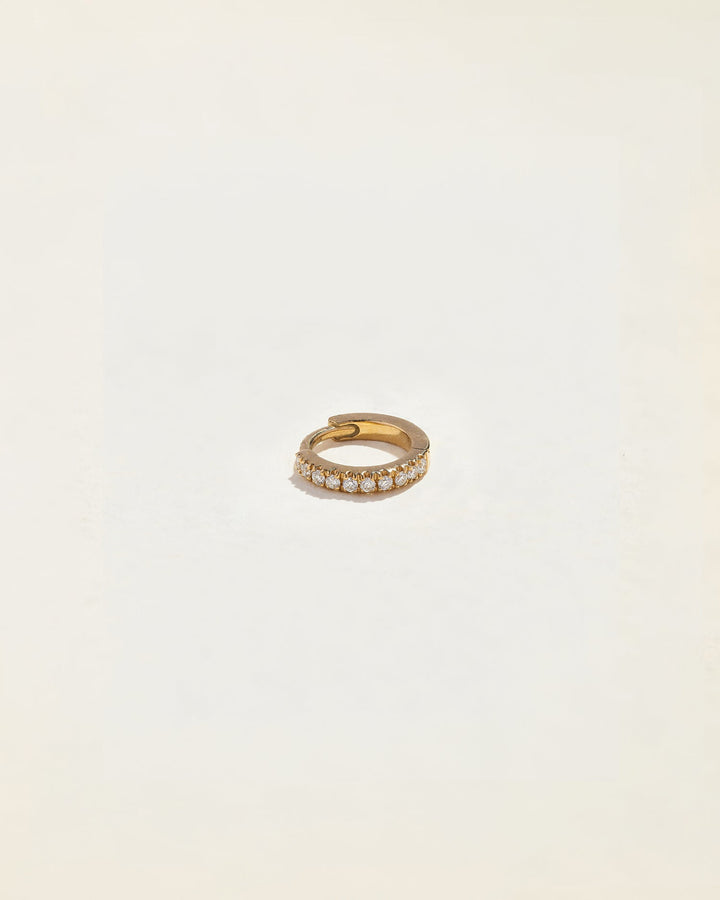 Handcrafted in 14k yellow gold with pavé-set diamonds. Inside diameter: 5mm. Hinge mechanism with a secure clicker closure. Sold as a single earring.
