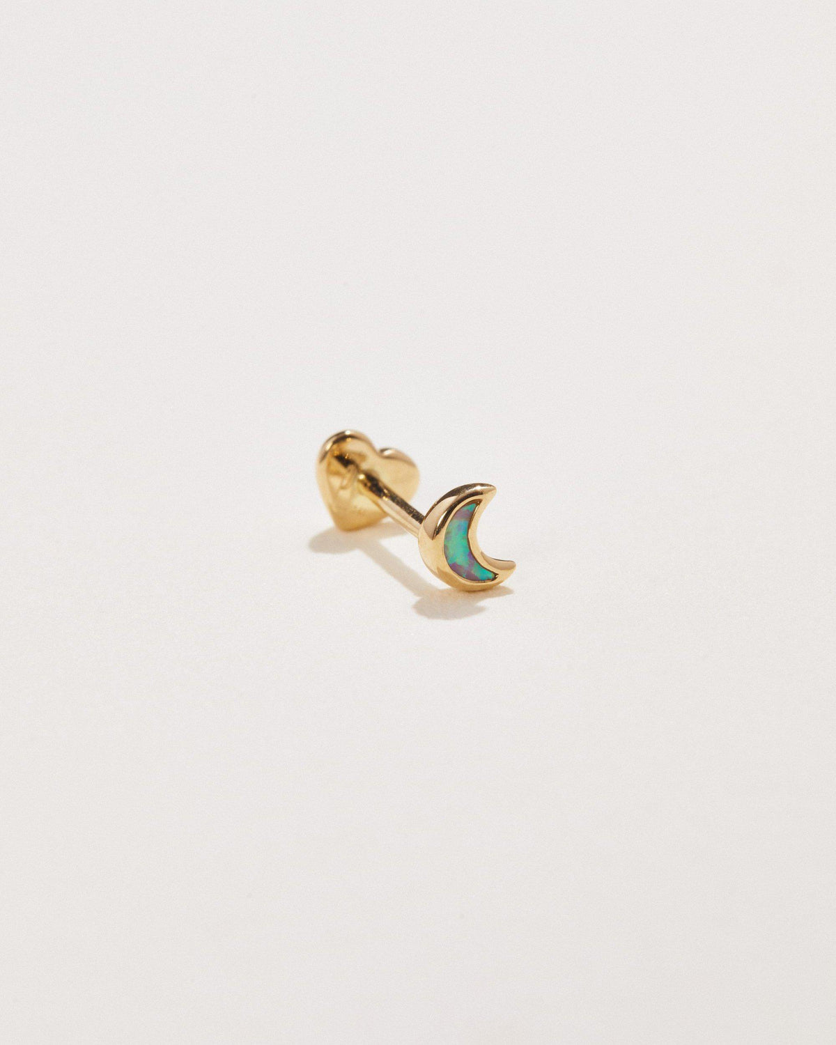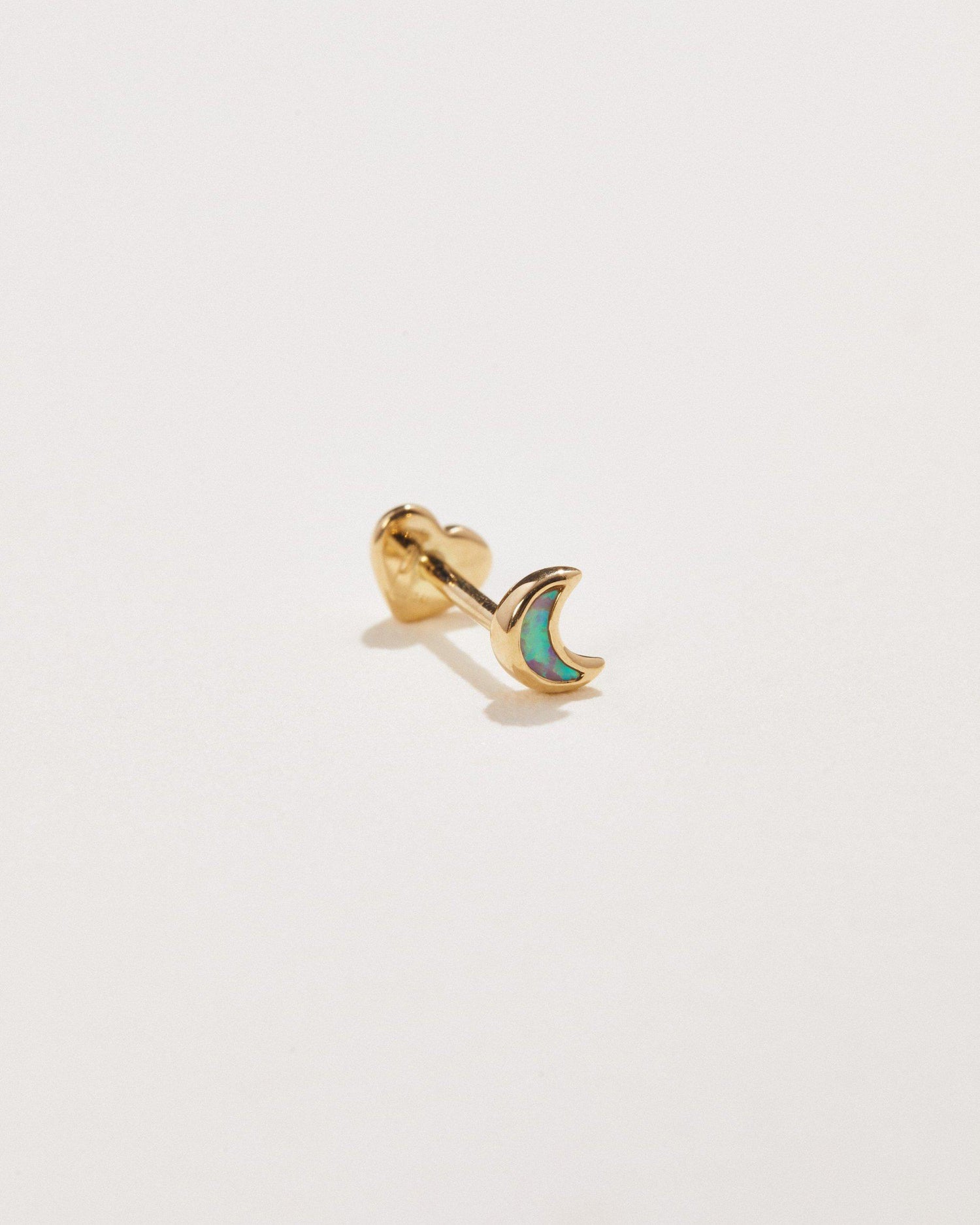 Handcrafted in 14k yellow gold with an opal inlay. Moon size: 3mm. Threaded back post thickness: 16 gauge (1.2mm), post length: 6.5mm. Internally threaded heart back closure. Sold as a single stud.