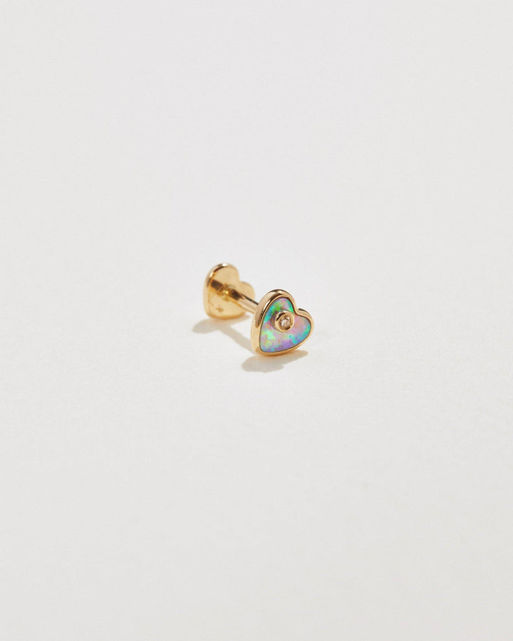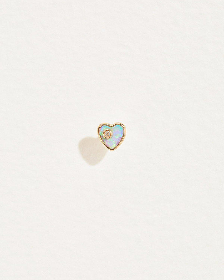This Heart Diamond Stud by Pamela Love is a romantic and playful piece, featuring a heart-shaped Gilson opal inlay with a sparkling white diamond accent. A whimsical addition to any ear stack, ideal for helix, lobe, and tragus piercings.