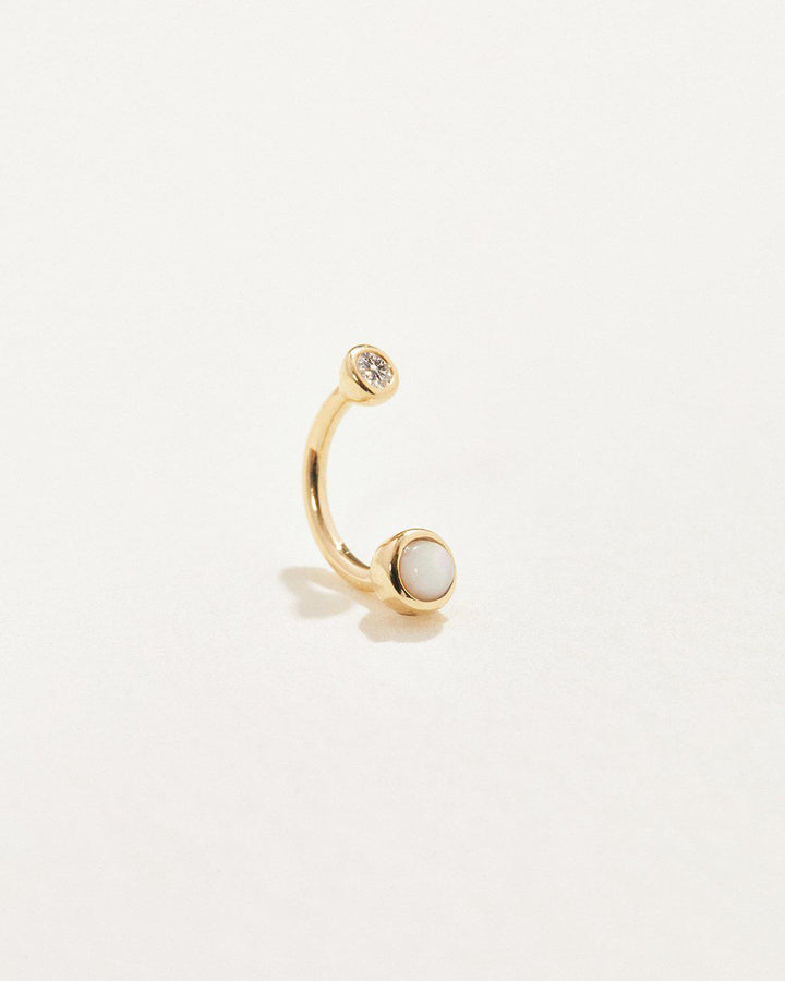 This Gravitation Hook by Pamela Love is a refined take on a classic piercing design, featuring an angled hook with a mini white diamond bezel end that connects to a screwable mother-of-pearl bezel basket. A versatile and minimalist choice for helix, lobe, tragus, and rook piercings.